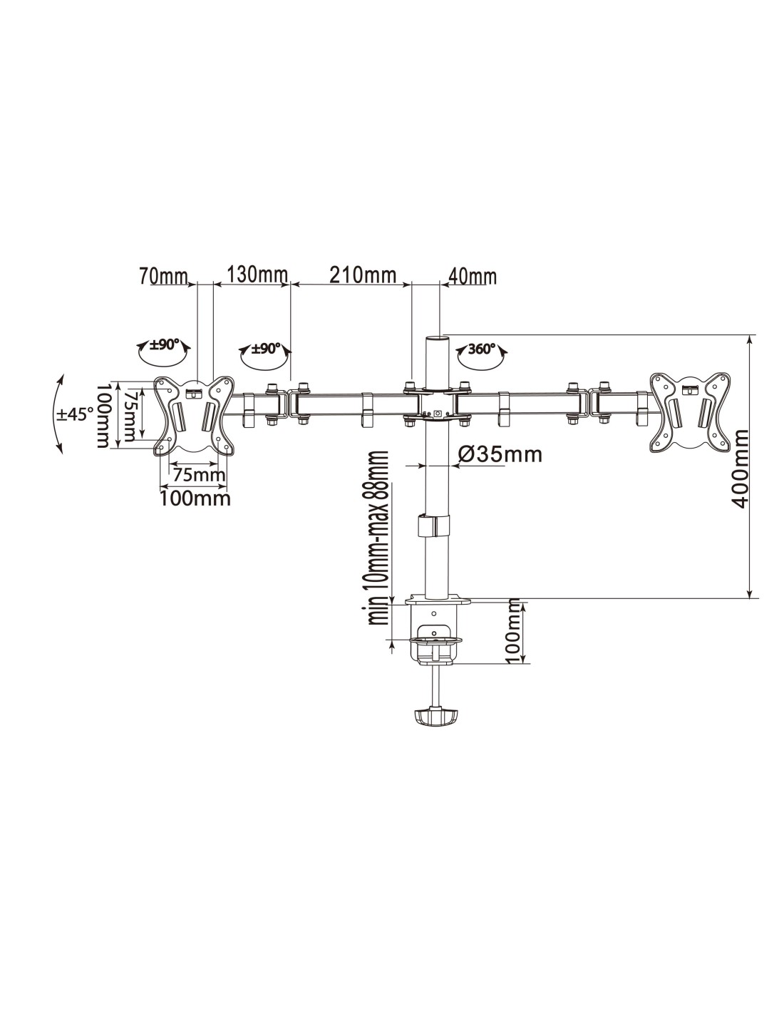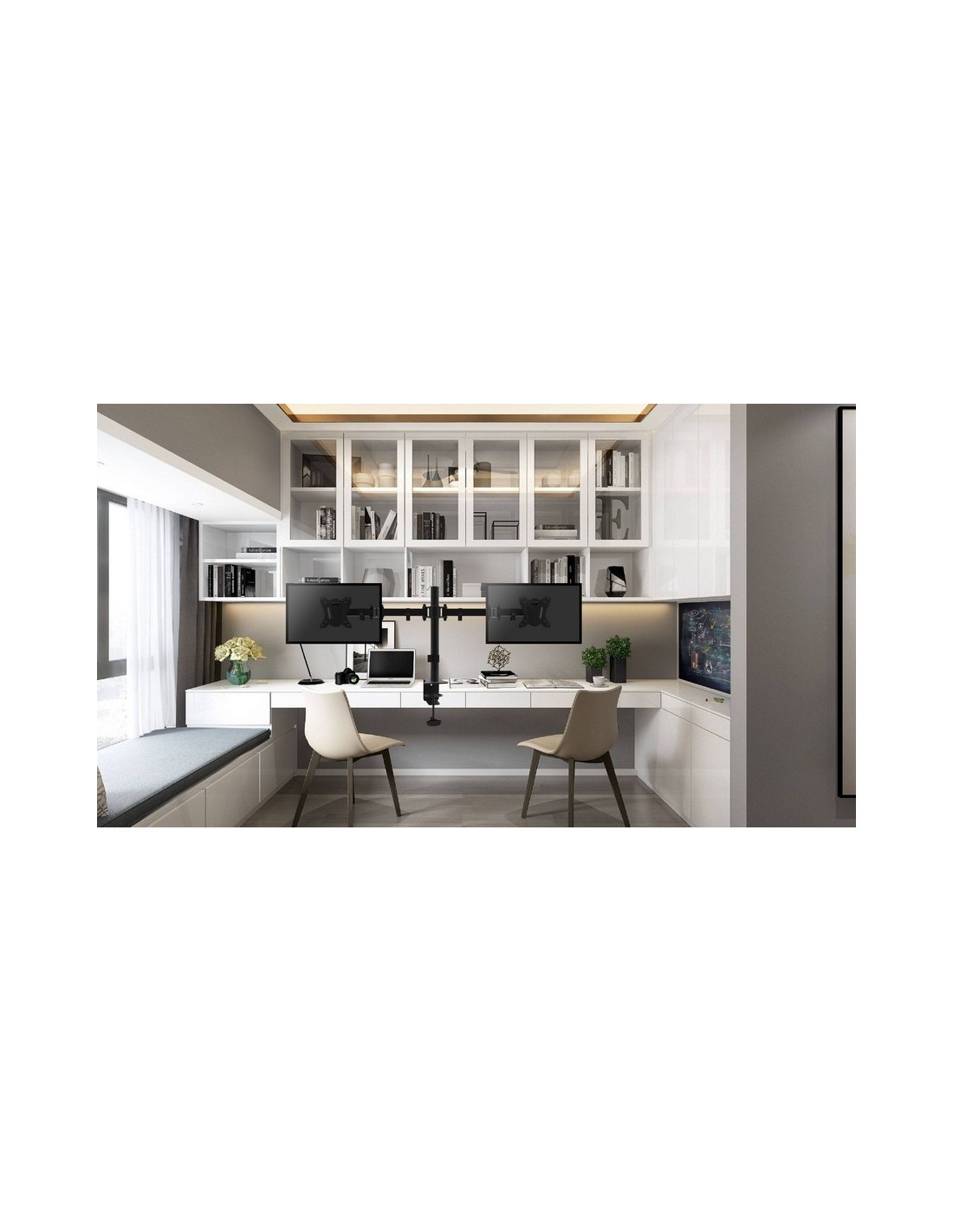 Equip 650152 Soporte articulado de sobremesa para dos monitores de 13"-27. Montaje: Abrazadera, Capacidad máxima de peso: 16 kg, Tamaño mínimo de pantalla: 33 cm (13"), Tamaño máximo de pantalla: 68,6 cm (27"), Compatibilidad con interfaz de montaje (min): 75 x 75 mm, Compatibilidad con interfaz de montaje (max): 100 x 100 mm. Ángulo de giro (alcance): -90 - 90°, Ángulo de inclinación: -45 - 45°. Color del producto: Negro