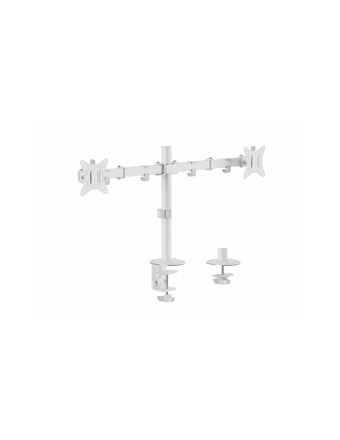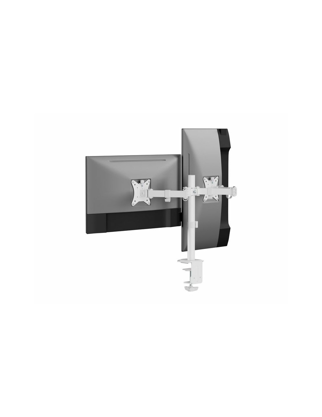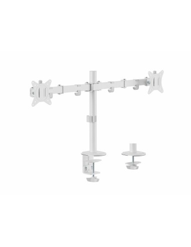 Equip Soporte de escritorio articulado para dos monitores de 17«-32», blanco. Montaje: Pinza/Atornillado, Capacidad máxima de peso: 18 kg, Tamaño mínimo de pantalla: 43,2 cm (17"), Tamaño máximo de pantalla: 81,3 cm (32"), Compatibilidad con interfaz de montaje (min): 75 x 75 mm, Compatibilidad con interfaz de montaje (max): 100 x 100 mm. Ajustes de altura, Ángulo de inclinación: -45 - 45°. Color del producto: Blanco