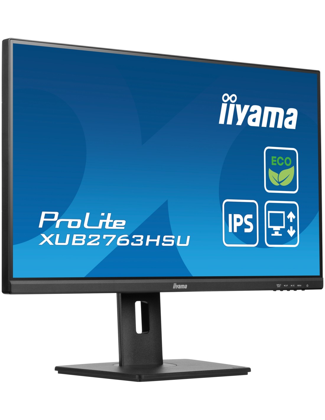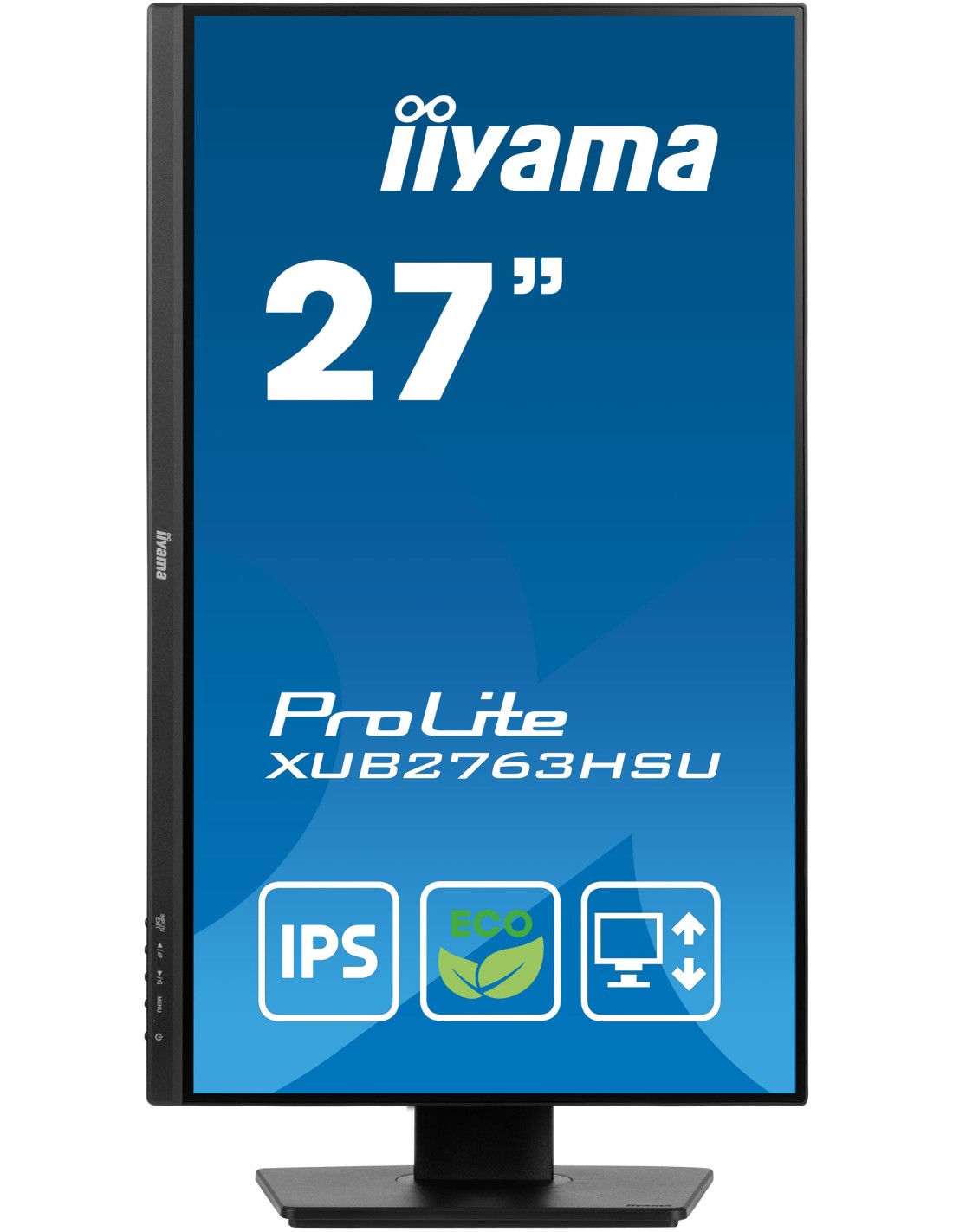 iiyama ProLite XUB2763HSU-B1. Diagonal de la pantalla: 68,6 cm (27"), Resolución de la pantalla: 1920 x 1080 Pixeles, Tipo HD: Full HD, Tecnología de visualización: LED, Superficie de la pantalla: Mate, Tiempo de respuesta: 3 ms, Relación de aspecto nativa: 16:9, Ángulo de visión, horizontal: 178°, Ángulo de visión, vertical: 178°. Altavoces incorporados. Conector USB incorporado, Versión de conector USB: 3.2 Gen 1 (3.1 Gen 1). montaje VESA, Ajustes de altura. Color del producto: Negro