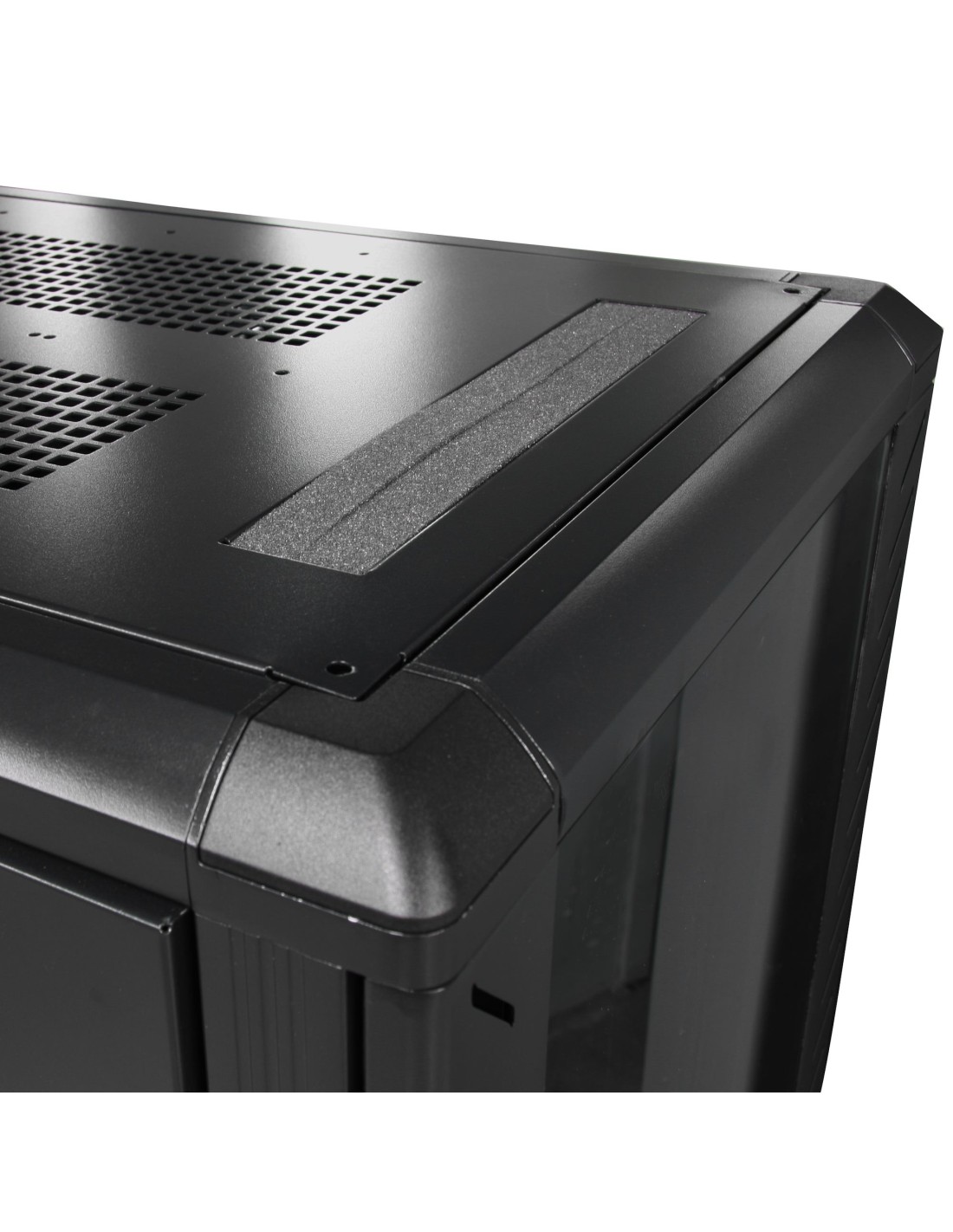 El rack cuenta con puertos cepillados en los paneles del techo y del suelo que le permiten pasar fácilmente el cableado hacia el interior y el exterior del armario, para una gestión discreta del cableado. Los paneles del suelo y del techo también se pueden quitar, lo que le permite personalizar su configuración, y el bastidor cuenta con orejetas de conexión a tierra que le permiten conectar a tierra su equipo para una mayor protección.