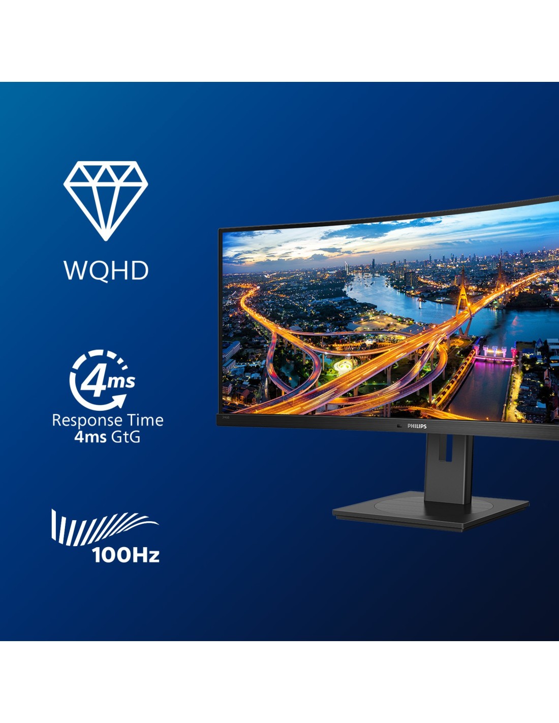 Philips B Line 346B1C/00. Diagonal de la pantalla: 86,4 cm (34"), Resolución de la pantalla: 3440 x 1440 Pixeles, Tipo HD: Quad HD, Tecnología de visualización: LCD, Superficie de la pantalla: Mate, Tiempo de respuesta: 4 ms, Relación de aspecto nativa: 21:9, Ángulo de visión, horizontal: 178°, Ángulo de visión, vertical: 178°. Altavoces incorporados. Conector USB incorporado, Versión de conector USB: 3.2 Gen 1 (3.1 Gen 1). montaje VESA, Ajustes de altura. Color del producto: Negro