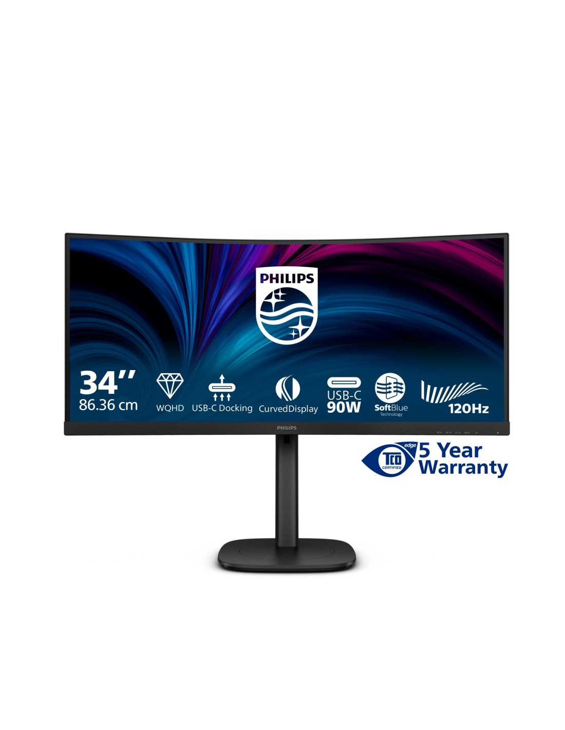Philips 3000 series 34B2U3600C/00. Diagonal de la pantalla: 86,4 cm (34"), Resolución de la pantalla: 3440 x 1440 Pixeles, Tipo HD: Wide Quad HD, Tecnología de visualización: LCD, Tiempo de respuesta: 4 ms, Relación de aspecto nativa: 21:9, Ángulo de visión, horizontal: 178°, Ángulo de visión, vertical: 178°. Altavoces incorporados. Conector USB incorporado, Versión de conector USB: 3.2 Gen 1 (3.1 Gen 1). montaje VESA, Ajustes de altura. Color del producto: Negro