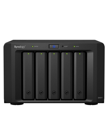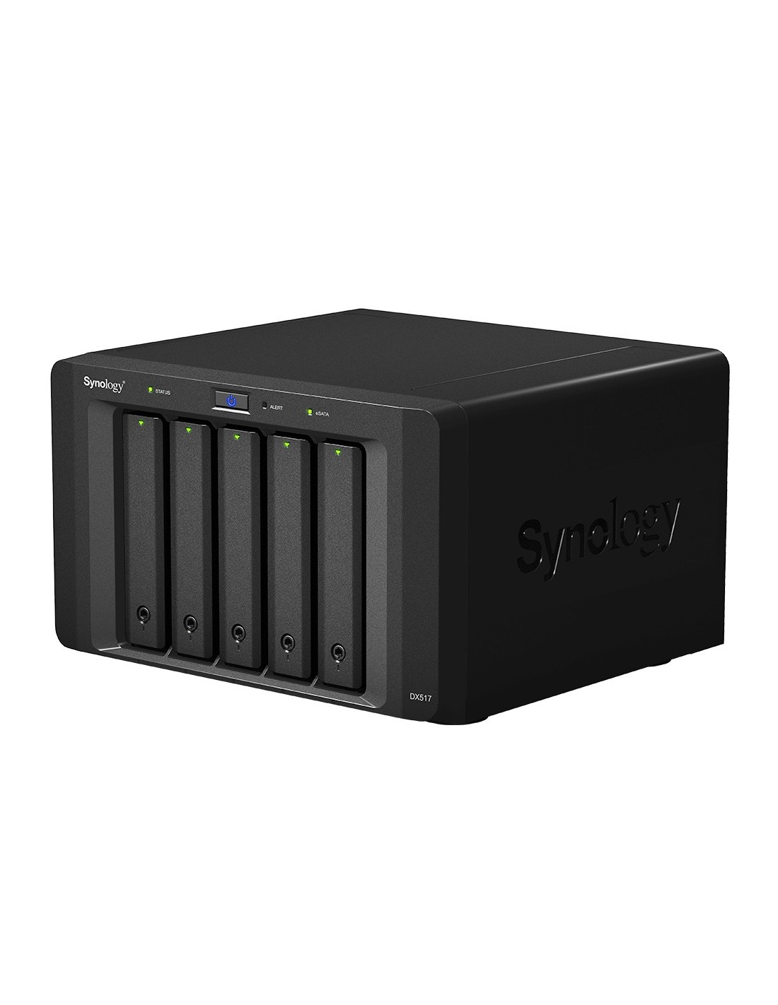 Synology DX517. Capacidad de almacenamiento total instalado: 0 TB. Tipo de chasis: Escritorio, Clase del dispositivo: Pequeñas y medianas empresas. Número de unidades de almacenamiento compatibles: 5, Tipos de unidades de almacenamiento admitidas: HDD & SSD, Interfaces de disco de almacenamiento soportados: SATA, Serial ATA II, Serial ATA III, Tamaños de almacenamiento en disco soportados: 2.5,3.5". Ancho: 248 mm, Profundidad: 233 mm, Altura: 157 mm, Peso: 3,91 kg. Color del producto: Negro