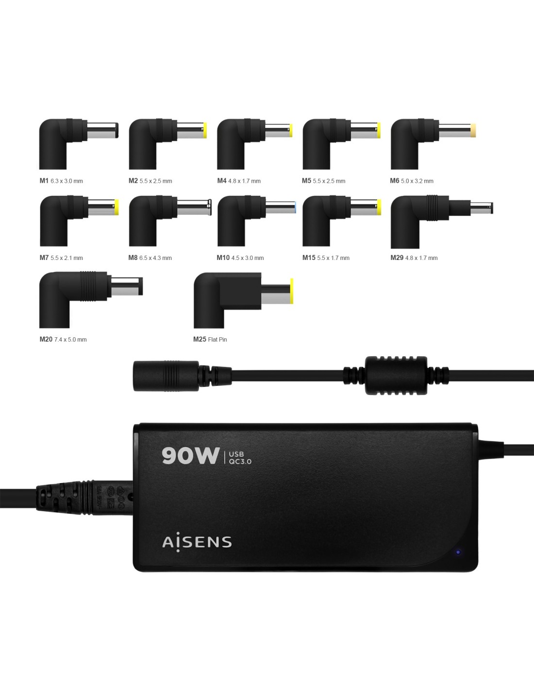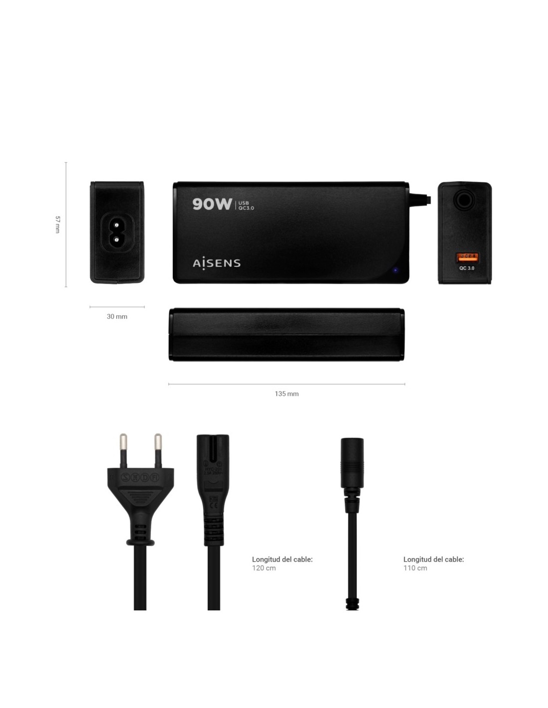 AISENS ASLC-90WAUTO-BK. Utilizar con: Universal, Tipo de fuente de alimentación: Interior, Voltaje de entrada: 100 - 240 V. Color del producto: Negro. Certificados de conformidad: CE, RoHS. Longitud de cable: 1,2 m, Ancho: 57 mm, Profundidad: 135 mm. Ancho del paquete: 138 mm, Profundidad del paquete: 55 mm, Altura del paquete: 225 mm
