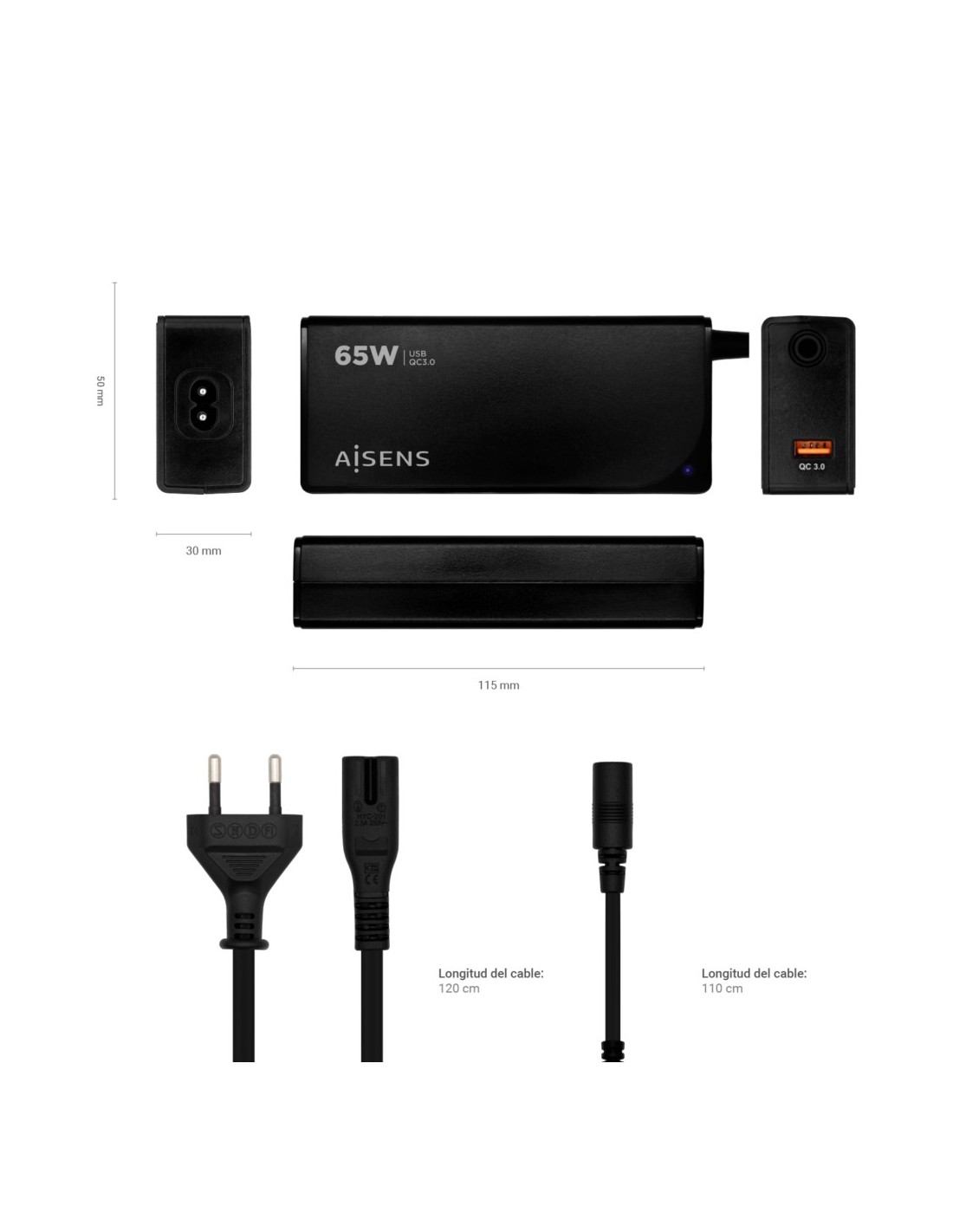 AISENS Cargador 65 W Automatico Universal Multitension Para Portatil Con 9 Conectores + USB-A QC.3.0, Universal, Interior, 100 - 240 V, 50 / 60 Hz, 65 W, 18.5 - 20 V