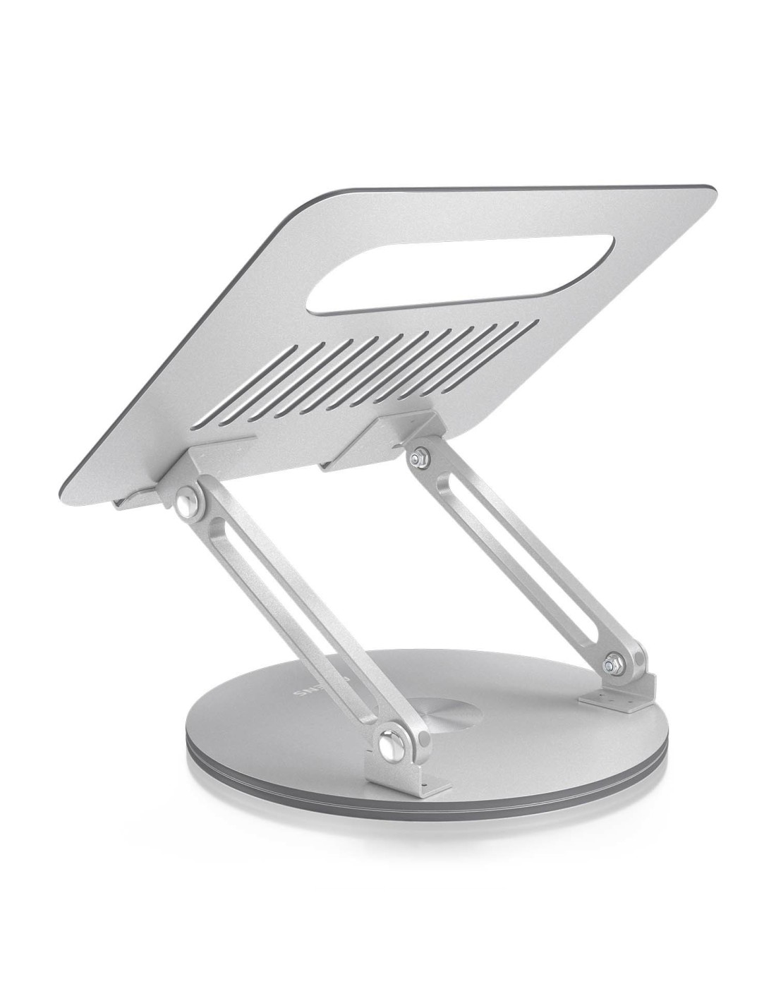 Este soporte está diseñado con una base giratoria que permite una rotación de 360 grados, brindando una versatilidad excepcional para ajustar la posición de tu portátil de manera cómoda y conveniente.