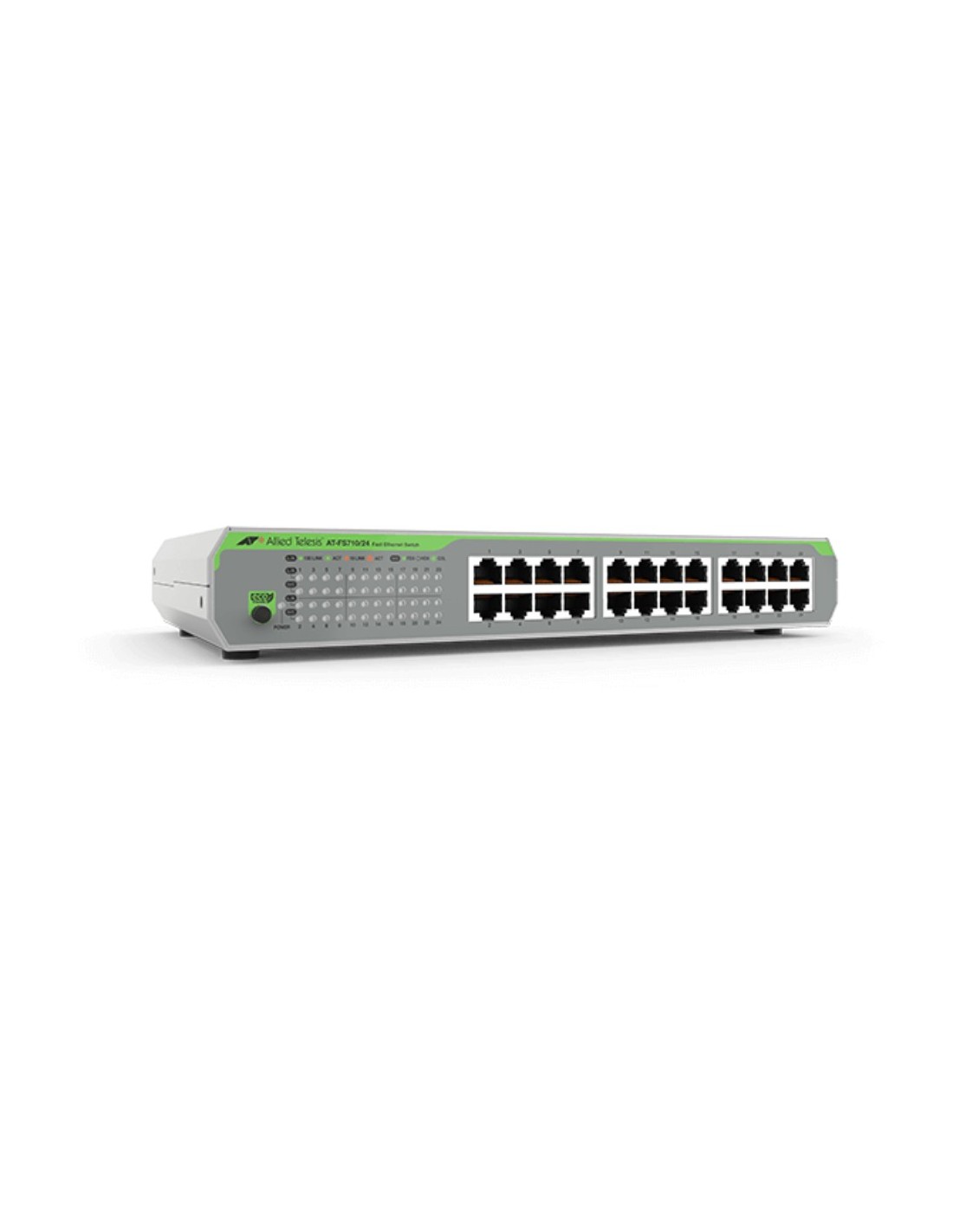 Allied Telesis FS710/24. Tipo de interruptor: No administrado. Puertos tipo básico de conmutación RJ-45 Ethernet: Fast Ethernet (10/100), Cantidad de puertos básicos de conmutación RJ-45 Ethernet: 24. Bidireccional completo (Full duplex). Tabla de direcciones MAC: 8000 entradas, Capacidad de conmutación: 4,8 Gbit/s. Estándares de red: IEEE 802.3, IEEE 802.3az, IEEE 802.3u, IEEE 802.3x. Montaje de pared, Montaje en rack