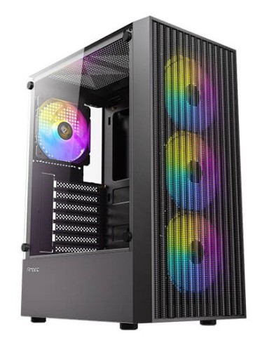 Antec AX27 RGB. Factor de forma: Midi Tower, Tipo: PC, Color del producto: Negro. Ventiladores frontales instalados: 3x 120 mm, Diámetro de ventiladores frontales soportados: 120,140 mm, Ventiladores traseros instalados: 1x 120 mm. Tamaños de disco duro soportados: 2.5,3.5". Ancho: 207 mm, Profundidad: 451 mm, Altura: 345 mm. Ancho del paquete: 250 mm, Profundidad del paquete: 490 mm, Altura del paquete: 397 mm