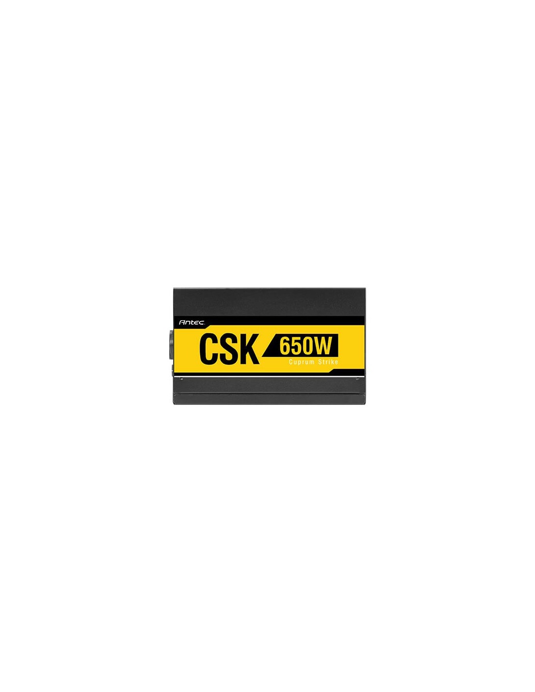 Antec CSK650. Potencia total: 650 W, Voltaje de entrada AC: 100 - 240 V, Frecuencia de entrada AC: 50/60 Hz. Alimentador de energía para tarjeta madre: 20+4 pin ATX, Longitud del cable de alimentación de la placa base: 55 cm, Longitud del cable de alimentación SATA: 500,650,800,950 mm. Utilizar con: PC, Factor de forma de fuente de alimentación (PSU): ATX, Certificación 80 PLUS: 80 PLUS Bronze. Color del producto: Negro, Tipo de enfriamiento: Activo, Diámetro de ventilador: 12 cm. Cables incluidos: Corriente alterna, CPU, PCIe, Peripheral (Molex), Peripheral (Molex) to SATA 3.3, SATA