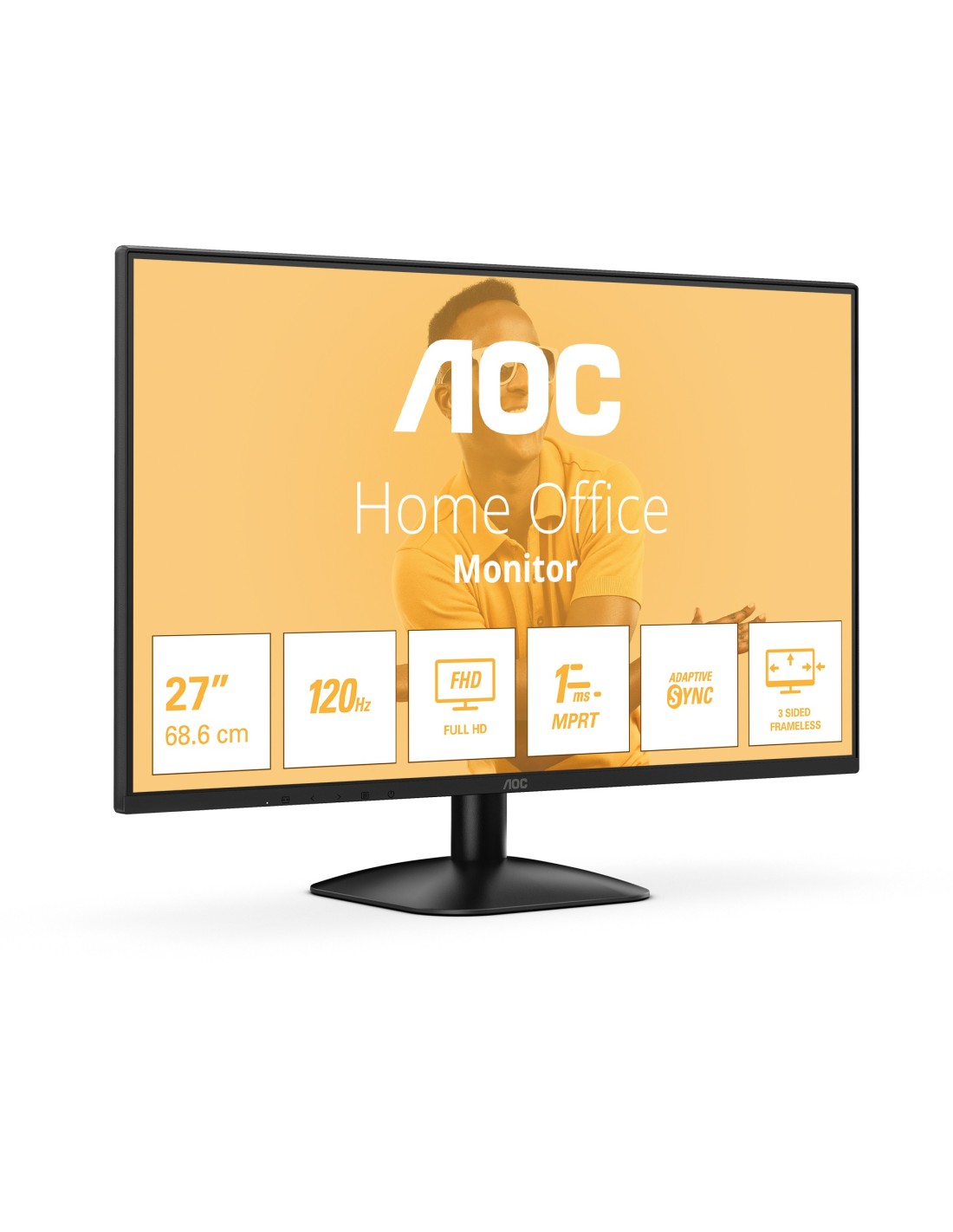 Pantalla Full HD de 27" con 120 Hz y sincronización adaptativa El AOC 27B31H cuenta con una pantalla Full HD de 27", frecuencia de actualización de 120 Hz, MPRT de 1 ms y sincronización Adaptive Sync. Consigue imágenes fluidas y gran capacidad de respuesta. Con poca luz azul, tecnología sin parpadeo y un diseño sin marco de 3 lados, garantiza comodidad visual y una experiencia visual inmersiva.