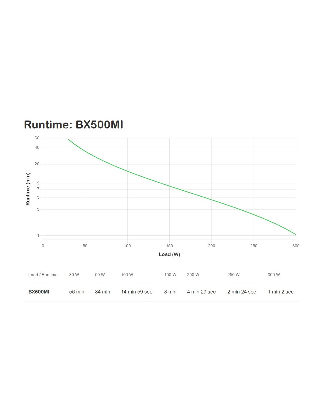 APC Back-UPS. Topología UPS: Línea interactiva, Capacidad de potencia de salida (VA): 0,5 kVA, Potencia de salida: 300 W. Tipo de salida AC: C13 acoplador, Conector: C14 acoplador, Cantidad de salidas AC: 3 salidas AC. Tecnología de batería: Sealed Lead Acid (VRLA), Voltaje de la pila: 12 V, Vida útil de la batería (máx.): 5 año(s). Factor de forma: Torre, Color del producto: Negro, Longitud de cable: 1,5 m. Certificados de conformidad: RoHS, Certificación: CE, EAC, EN/IEC 62040-1