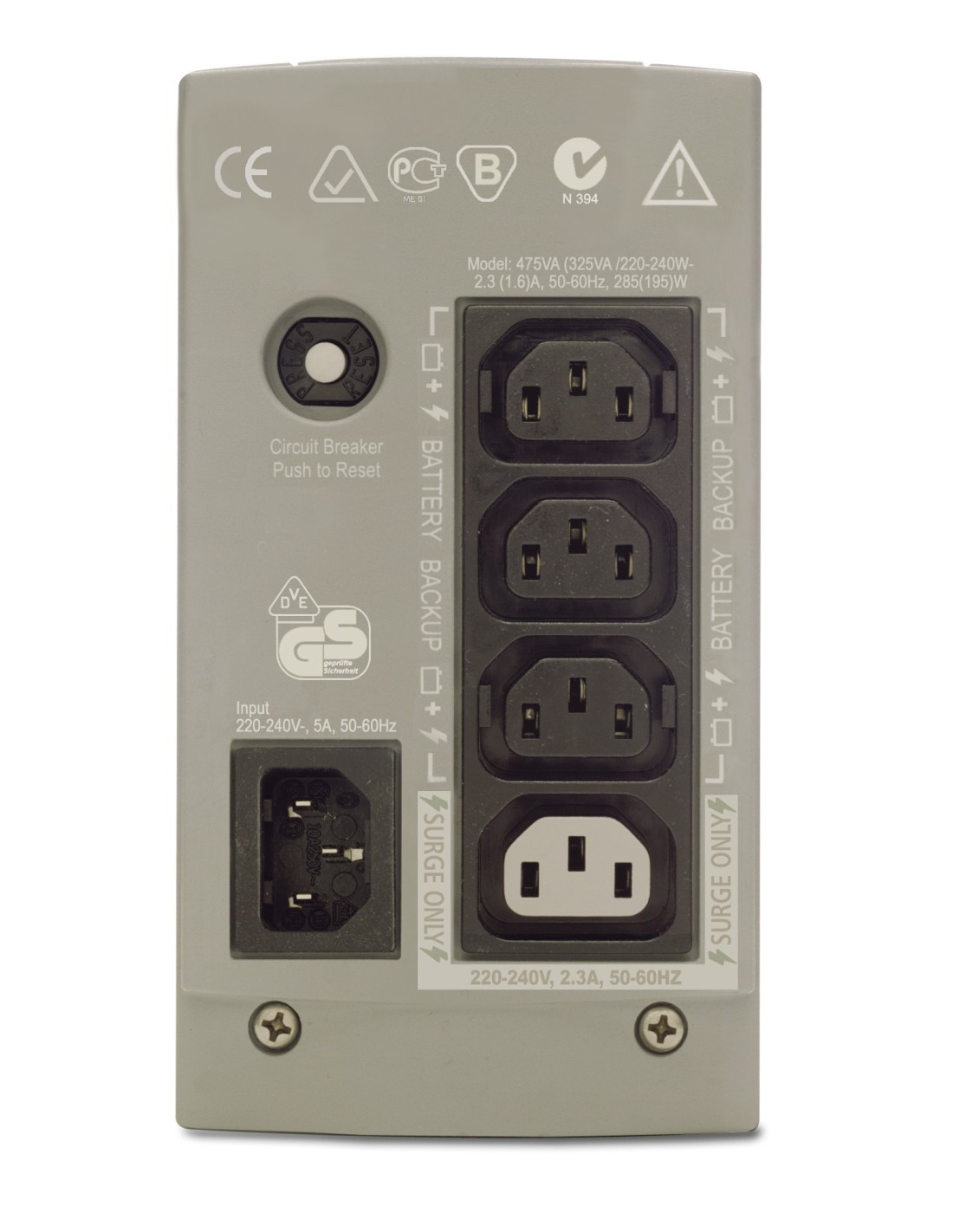 APC Back-UPS CS 325 w/o SW. Capacidad de potencia de salida (VA): 0,325 kVA, Potencia de salida: 210 W, Índice de aumento de energía: 320 J. Tipo de salida AC: IEC 60320. Tecnología de batería: Sealed Lead Acid (VRLA), Tiempo de recarga de la batería: 6 h. Color del producto: Beige. Certificación: C-tick,CE,EN 50091-1,EN 50091-2,GOST,VDE