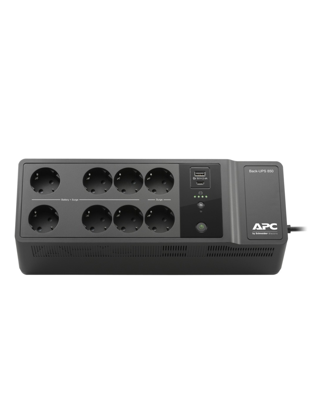APC BE850G2-SP. Topología UPS: En espera (Fuera de línea) o Standby (Offline), Capacidad de potencia de salida (VA): 0,85 kVA, Potencia de salida: 520 W. Tipo de salida AC: Tipo F, Cantidad de salidas AC: 8 salidas AC, Tipo de puerto USB: USB Tipo C. Tecnología de batería: Sealed Lead Acid (VRLA), Capacidad de la batería: 93 Ah, Vida útil de la batería (máx.): 5 año(s). Factor de forma: Compacto, Color del producto: Negro, Longitud de cable: 1,83 m. Certificados de conformidad: RoHS, Certificación: CE, EAC REACH