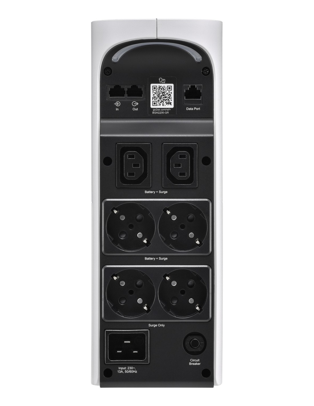 APC BGM2200-GR. Topología UPS: Línea interactiva, Capacidad de potencia de salida (VA): 2,2 kVA, Potencia de salida: 1320 W. Tipo de salida AC: C13 acoplador, Cantidad de salidas AC: 6 salidas AC, Tipo de serie de interfaz: RJ-45. Tecnología de batería: Sealed Lead Acid (VRLA), Voltaje de la pila: 24 V, Vida útil de la batería (máx.): 5 año(s). Factor de forma: Torre, Color del producto: Blanco, Capacidad del rack: 0U. Certificación: IEC 62040-1-1 IEC 62040-2