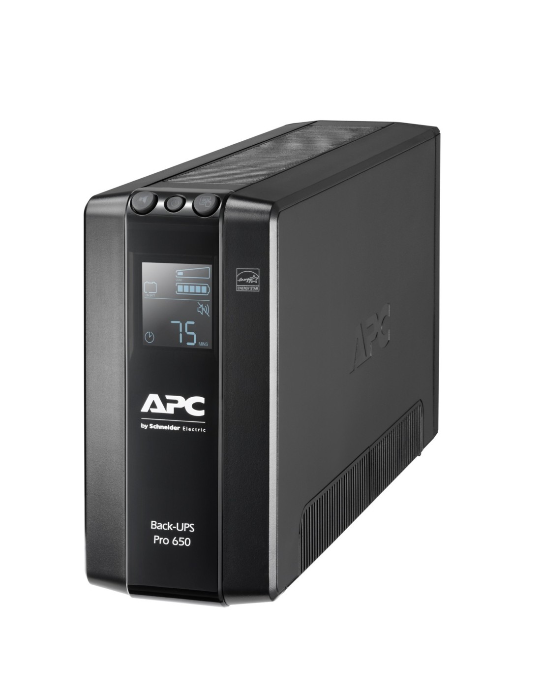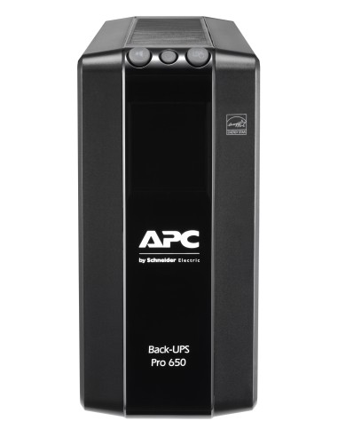 APC BR650MI. Topología UPS: Línea interactiva, Capacidad de potencia de salida (VA): 0,65 kVA, Potencia de salida: 390 W. Tipo de salida AC: C13 acoplador, Conector: C14 acoplador, Cantidad de salidas AC: 6 salidas AC. Tecnología de batería: Sealed Lead Acid (VRLA), Vida útil de la batería (máx.): 5 año(s), Tiempo de recarga de la batería: 12 h. Factor de forma: Torre, Color del producto: Negro, Longitud de cable: 1,83 m. Certificación: A-tick, C-tick, CE, EAC, GS Mark, RCM, TISI