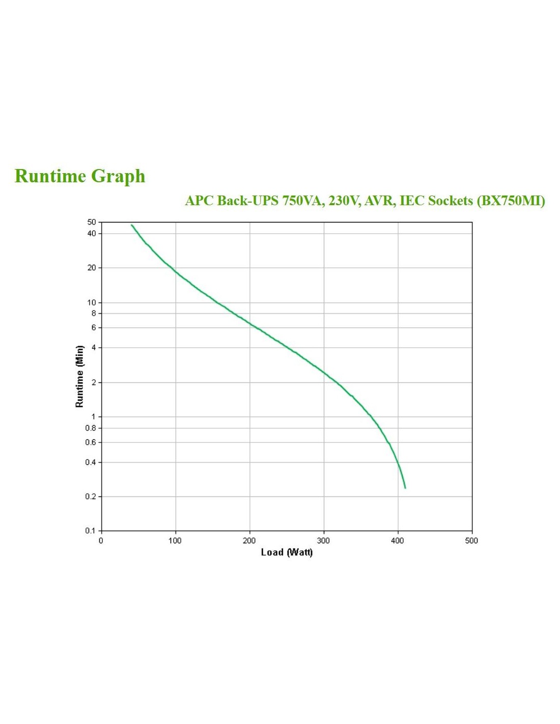 APC BX750MI. Topología UPS: Línea interactiva, Capacidad de potencia de salida (VA): 0,75 kVA, Potencia de salida: 410 W. Tipo de salida AC: C13 acoplador, Conector: C14 acoplador, Cantidad de salidas AC: 4 salidas AC. Tecnología de batería: Sealed Lead Acid (VRLA), Tiempo típico de respaldo a carga completa: 1 min, Tiempo típico de respaldo a media carga: 8,5 min. Factor de forma: Compacto, Color del producto: Negro, Longitud de cable: 1,2 m. Certificados de conformidad: RoHS, Certificación: CB Meet EN62040-1 / CE / IEC-62040-1 / IEC-62040-2