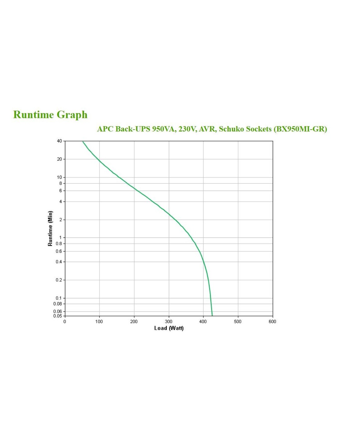 APC BX950MI-GR. Topología UPS: Línea interactiva, Capacidad de potencia de salida (VA): 0,95 kVA, Potencia de salida: 520 W. Tipo de salida AC: Tipo F, Conector: Tipo F, Cantidad de salidas AC: 4 salidas AC. Tecnología de batería: Sealed Lead Acid (VRLA), Tiempo típico de respaldo a carga completa: 1 min, Tiempo típico de respaldo a media carga: 6,5 min. Factor de forma: Compacto, Color del producto: Negro, Longitud de cable: 1,2 m. Certificados de conformidad: RoHS, Certificación: CB Meet EN62040-1 / CE / IEC-62040-1 / IEC-62040-2