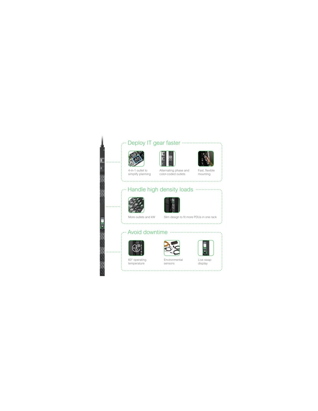 APC NetShelter Rack PDU Advanced. PDU tipos: Regulado, Capacidad del rack: 0U, Tipo: Trifásico. Cantidad de salidas AC: 42 salidas AC, Tipo de salida AC: C13 acoplador, C15 acoplador, C19 acoplador, C21 acoplador, Conector: IEC 60309. Indicadores LED: Actividad, Red, Poder, Longitud de cable: 1,8 m, Algoritmos de seguridad soportados: 128-bit AES, 192-bit AES, 256-bit AES, DES, MD5, SNMP, SNMPv2, SNMPv3. Monitoreo: Corriente, Humedad, Poder, Temperatura, Tensión, Salida de control: Bloqueo, Reciclaje, Encender, Firmware actualizable mediante: Red, USB. Voltaje nominal de entrada: 400 V, Máxima corriente: 16 A, Frecuencia de entrada AC: 50 - 60 Hz