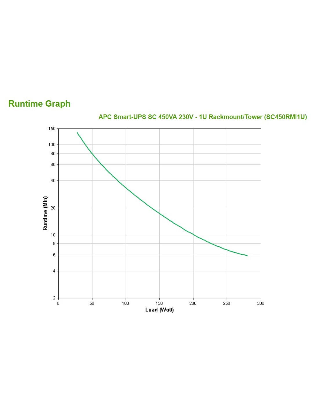APC Smart-UPS. Topología UPS: Línea interactiva, Capacidad de potencia de salida (VA): 0,45 kVA, Potencia de salida: 280 W. Tipo de salida AC: C13 acoplador, Conector: C14 acoplador, Cantidad de salidas AC: 4 salidas AC. Tecnología de batería: Sealed Lead Acid (VRLA), Capacidad de la batería: 108 VAh, Tiempo típico de respaldo a carga completa: 5,9 min. Factor de forma: Montaje en rack/Torre o Montaje en bastidor/Torre, Color del producto: Gris, Capacidad del rack: 1U. Certificados de conformidad: RoHS, Certificación: C-tick, CE, GOST, VDE, PEP, EOLI