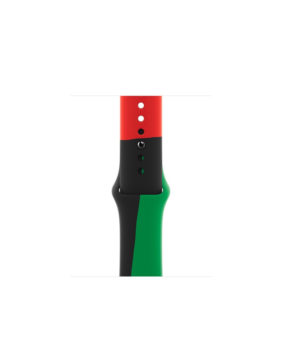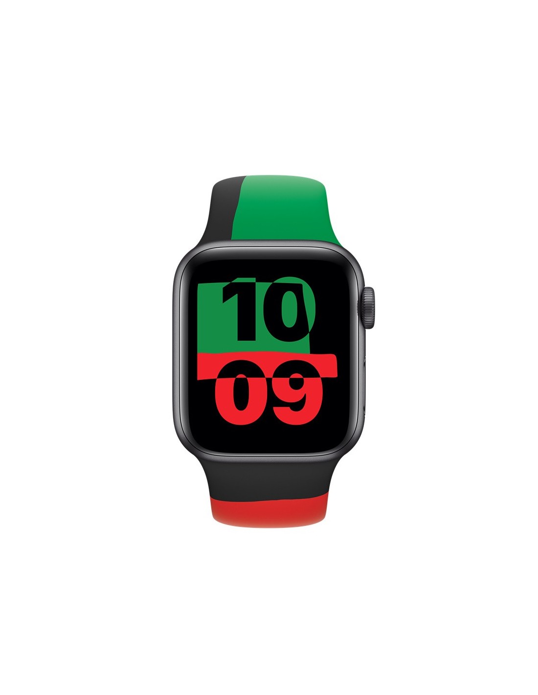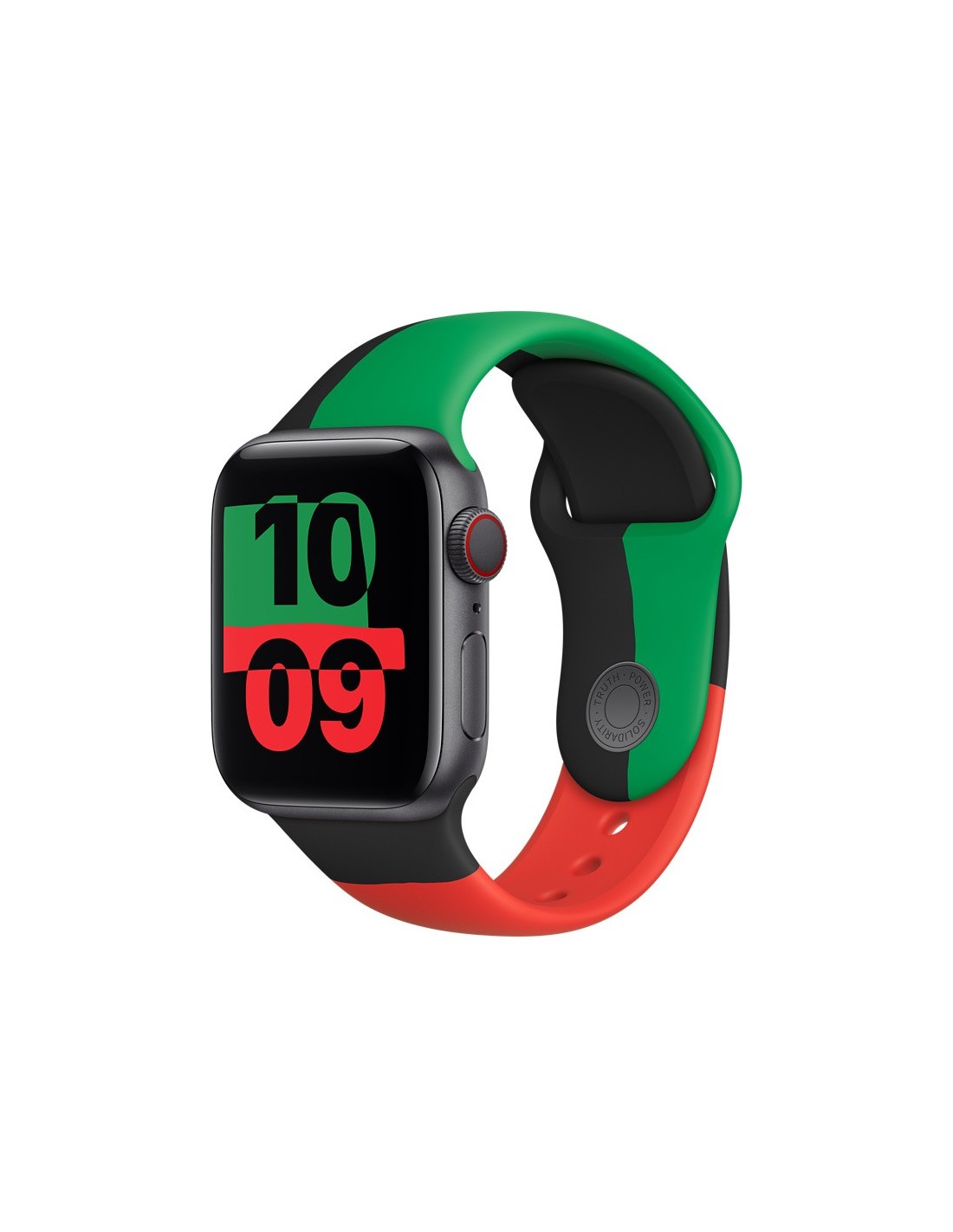 La correa deportiva Black Unity, diseñada por creativos negros y aliados para reconocer y celebrar su historia y su cultura, se inspira en los colores de la bandera panafricana y rinde homenaje a los tapices artesanales tradicionales africanos. La correa está compuesta por tres piezas de fluoroelastómero en distintos colores, unidas a mano y moldeadas por compresión como si fueran una sola. El diseño se completa con la esfera Unity dinámica a juego, que muestra un patrón de formas irregulares que van cambiando cuando se mueve el Apple Watch. Así, los tres colores se unen para formar un tapiz único. El innovador cierre de clip tiene grabado con láser el mensaje «Truth. Power. Solidarity.»