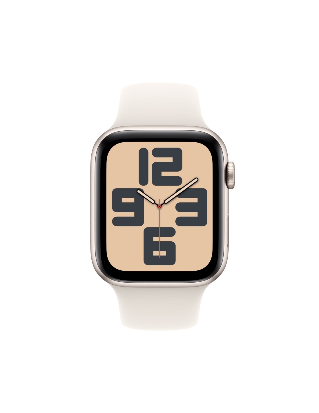 Apple Watch SE. Tecnología de visualización: OLED, Resolución de la pantalla: 368 x 448 Pixeles, Pantalla táctil. Memoria flash: 32 GB. Wifi. GPS (satélite). Peso: 32,9 g. Humedad: resistente al agua hasta: 50 m, Material de la banda: Caucho, Color de banda: Beige, Tamaño de banda: M/L. Sistema operativo instalado: watchOS 11