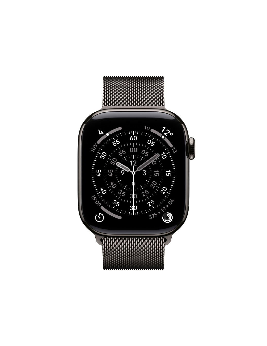 Apple Watch Series 11 . Tecnología de visualización: OLED, Resolución de la pantalla: 374 x 446 Pixeles, Pantalla táctil. Memoria flash: 64 GB. Wifi. GPS (satélite). Peso: 34,6 g. Humedad: resistente al agua hasta: 50 m, Material de la banda: Acero inoxidable, Color de banda: Titanio. Sistema operativo instalado: watchOS 11