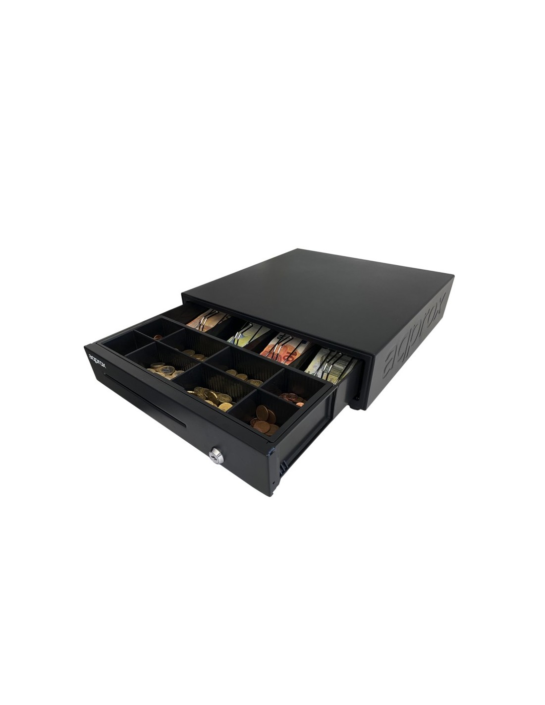 Dispone de compartimento de billetes y cajonera de monedas extraíble, ambos totalmente ajustables. Además, incorpora ranura frontal para guardar cheques sin necesidad de abrir el cajón.