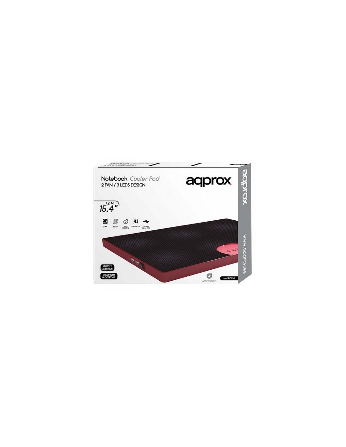 Approx appNBC05R. Tamaño máximo de pantalla: 39,1 cm (15.4"), Número de ventiladores incluidos: 2 pieza(s), Velocidad de rotación: 1500 RPM. Color del producto: Negro, Rojo, Material: Metal, Plástico. Alimentación: USB, Requisitos de energía: 5V DC. Peso: 410 g. Cables incluidos: USB, Ancho del paquete: 380 mm, Altura del paquete: 53 mm