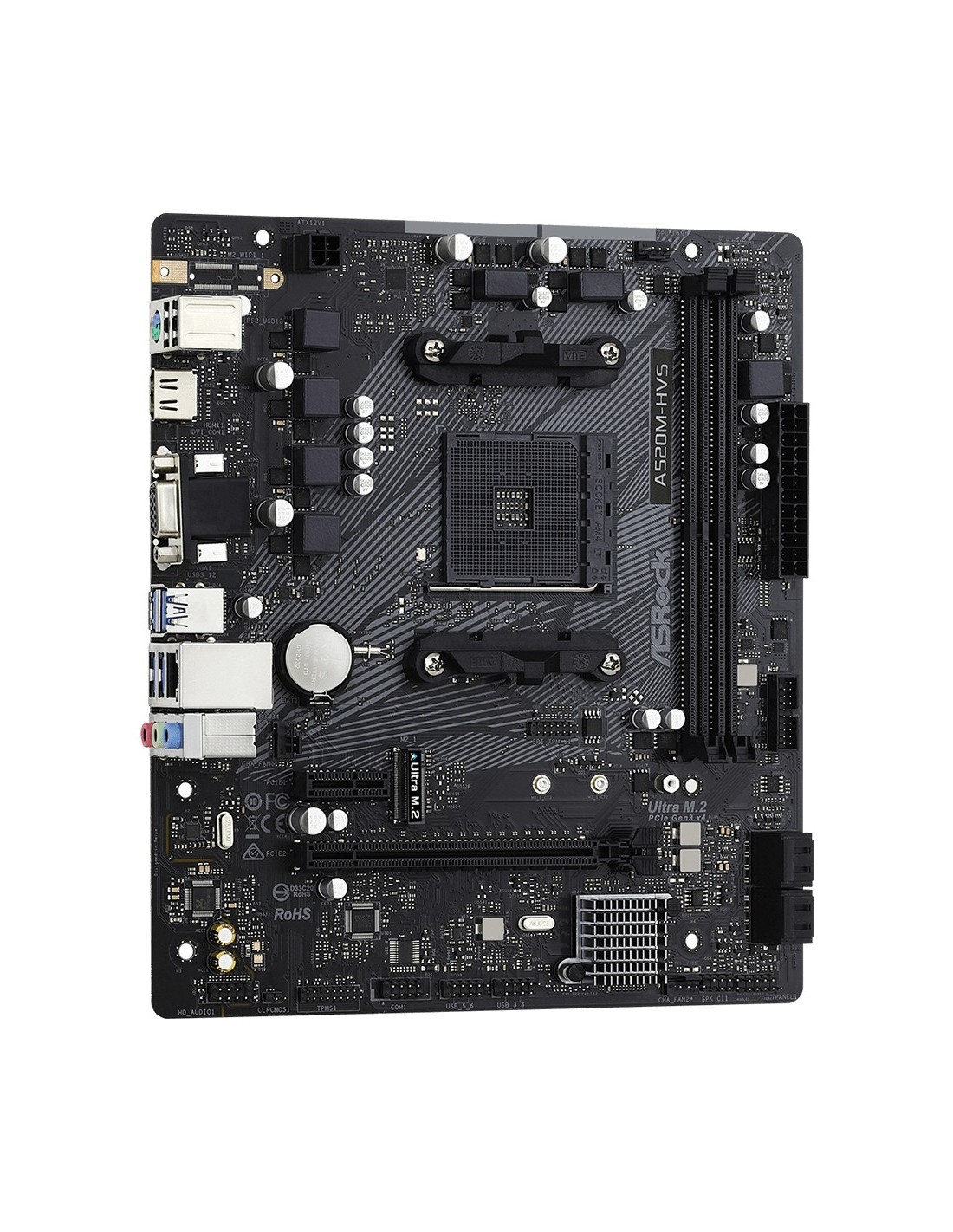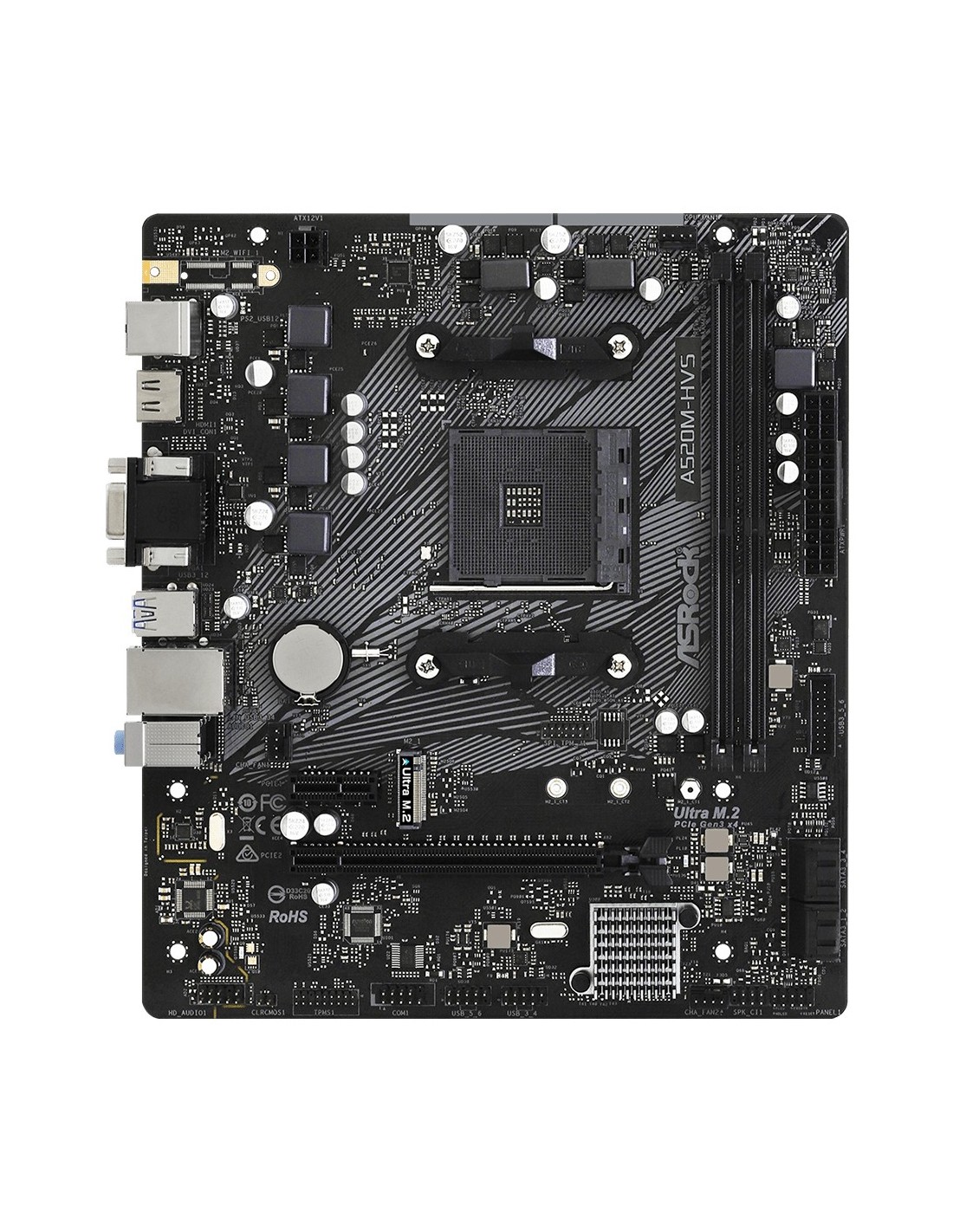 Asrock A520M-HVS. Fabricante de procesador: AMD, Socket de procesador: Zócalo AM4, Procesador compatible: AMD Ryzen 3000 Series. tipos de memoria compatibles: DDR4-SDRAM, Memoria interna máxima: 64 GB, Tipo de ranuras de memoria: DIMM. Interfaces de disco de almacenamiento soportados: M.2, SATA III. Graphics chipset: AMD, Adaptador gráfico: Radeon Vega. Tipo de interfaz ethernet: Gigabit Ethernet, Controlador LAN: Realtek RTL8111H
