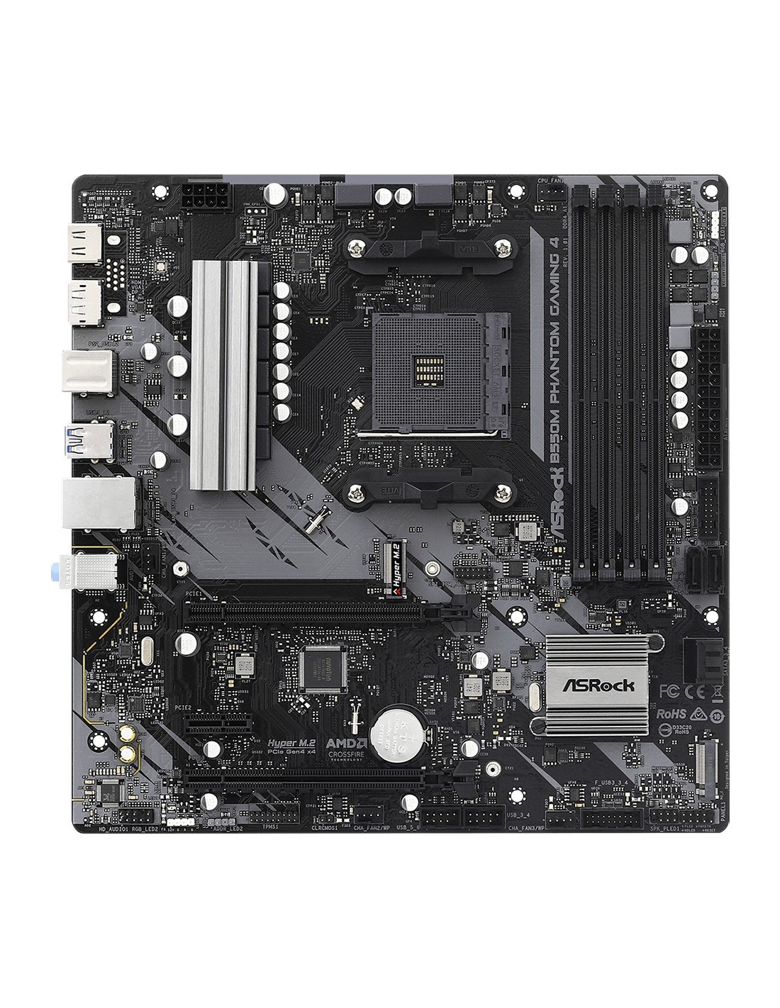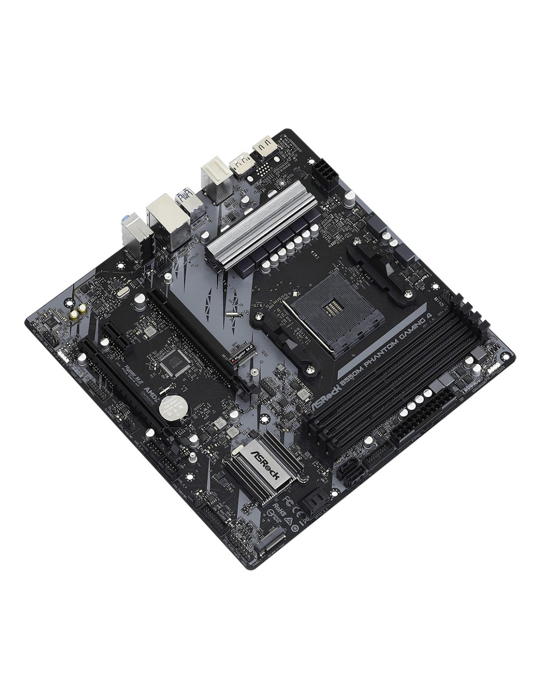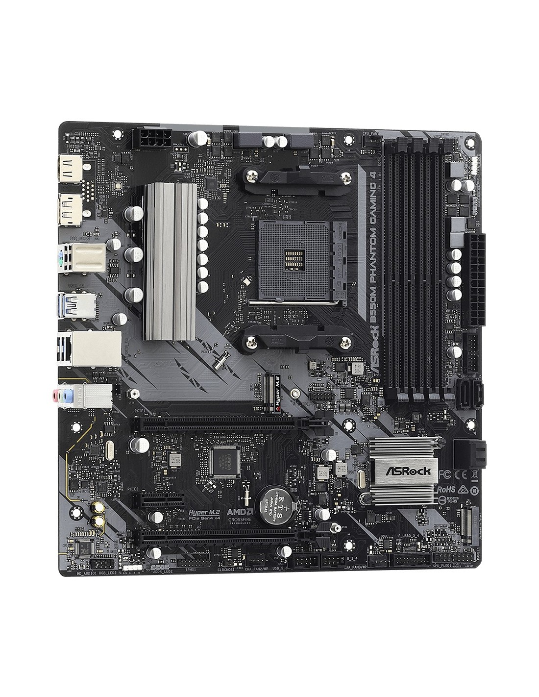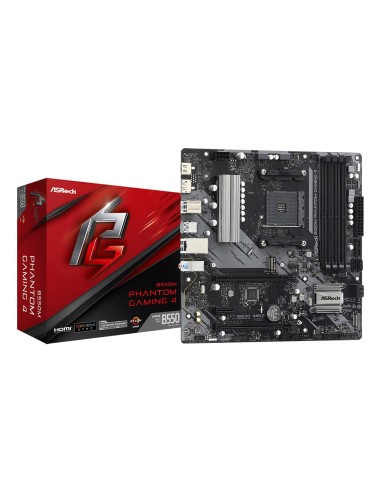 Asrock B550M Phantom Gaming 4. Fabricante de procesador: AMD, Socket de procesador: Zócalo AM4, Procesador compatible: AMD Ryzen 3000 Series. tipos de memoria compatibles: DDR4-SDRAM, Memoria interna máxima: 128 GB, Tipo de ranuras de memoria: DIMM. Interfaces de disco de almacenamiento soportados: SATA III, Tipos de unidades de almacenamiento admitidas: HDD & SSD. Máxima resolución: 5120 x 2880 Pixeles. Tipo de interfaz ethernet: Gigabit Ethernet, Controlador LAN: Realtek RTL8111H