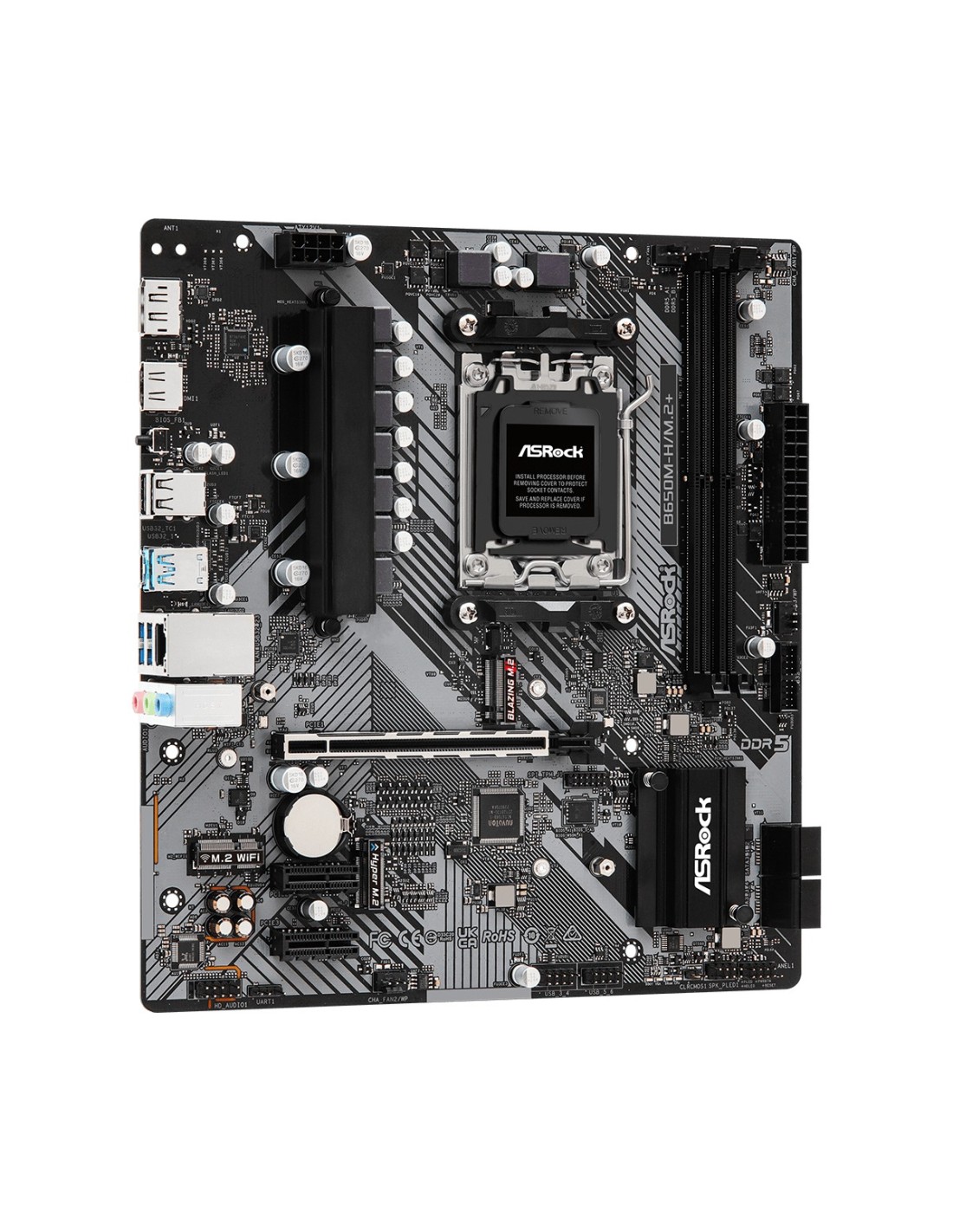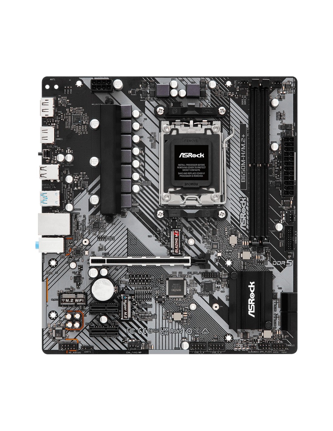 Asrock B650M-H/M.2+. Fabricante de procesador: AMD, Socket de procesador: Zócalo AM5. tipos de memoria compatibles: DDR5-SDRAM, Memoria interna máxima: 96 GB, Tipo de ranuras de memoria: DIMM. Interfaces de disco de almacenamiento soportados: M.2, SATA III, Niveles RAID: 0, 1, 10. Graphics chipset: AMD. Tipo de interfaz ethernet: Gigabit Ethernet, Controlador LAN: Realtek RTL8111H