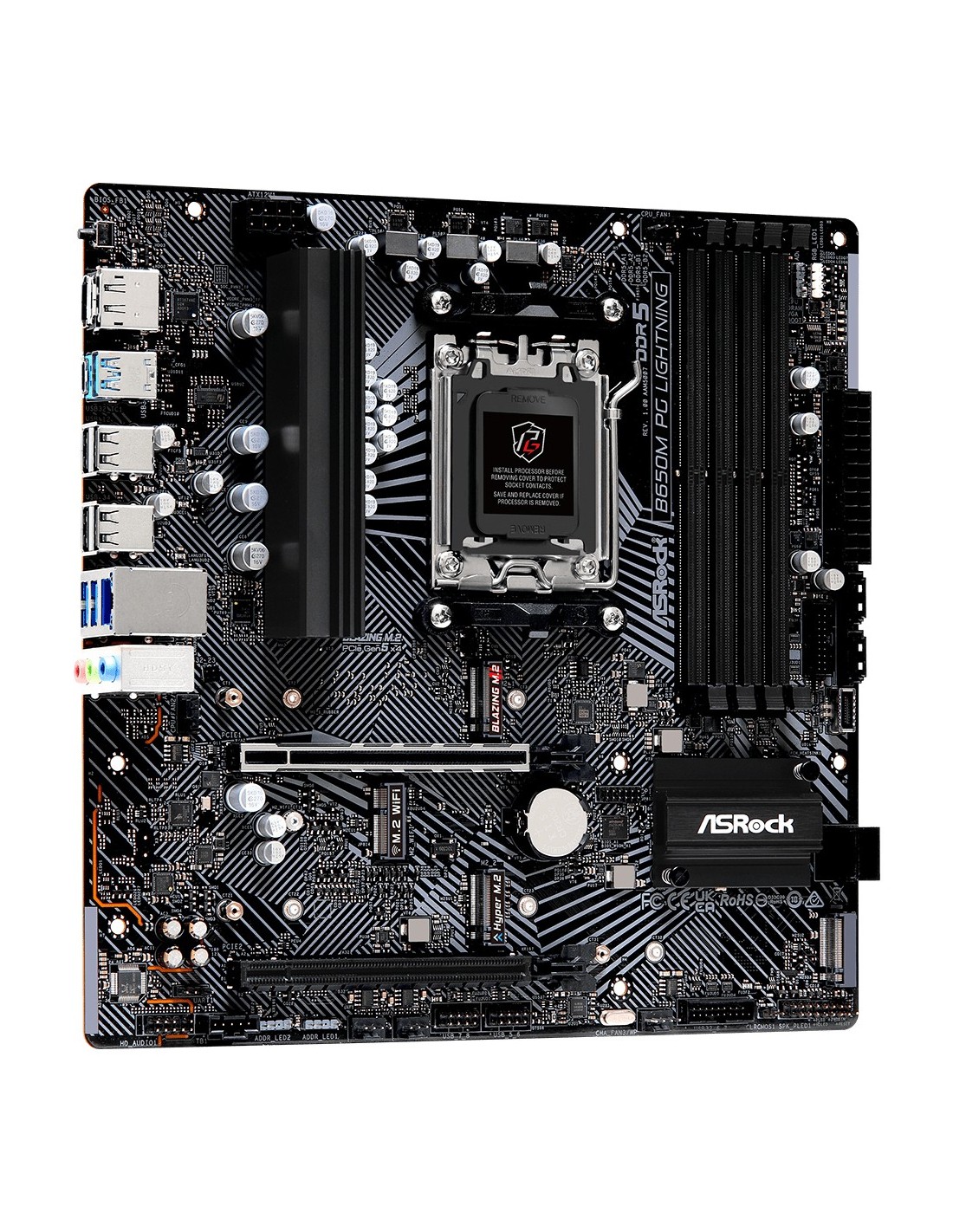 Asrock B650M PG Lightning. Fabricante de procesador: AMD, Socket de procesador: Zócalo AM5, Procesador compatible: AMD Ryzen 7000 Series. tipos de memoria compatibles: DDR5-SDRAM, Memoria interna máxima: 192 GB, Tipo de ranuras de memoria: DIMM. Interfaces de disco de almacenamiento soportados: M.2, PCI Express 4.0, PCI Express 5.0, SATA III, Tipos de unidades de almacenamiento admitidas: HDD & SSD, Niveles RAID: 0, 1, 10. Soporte para proceso paralelo: CrossFire, Máxima resolución: 3840 x 2160 Pixeles. Conector USB: USB tipo A, USB Tipo C