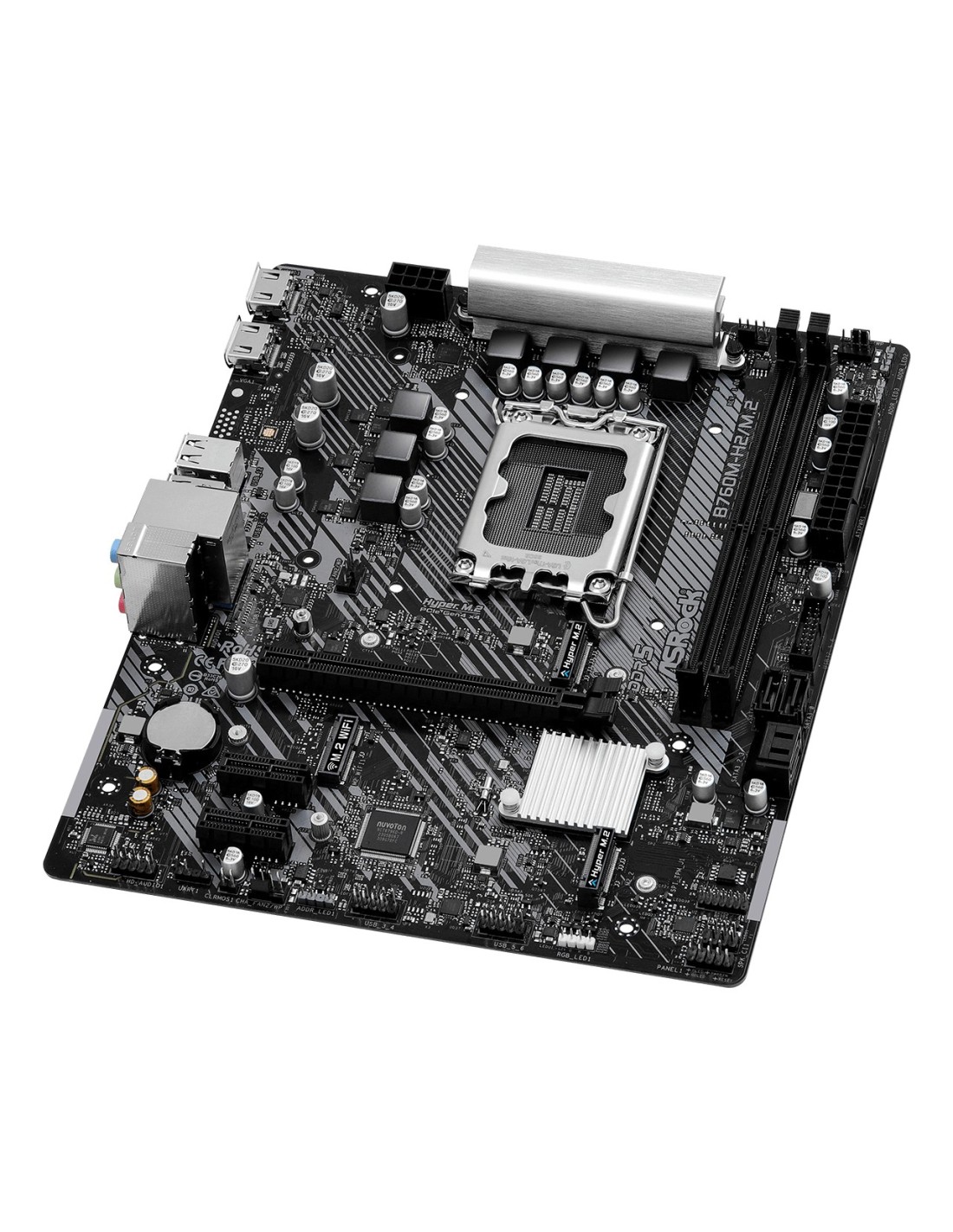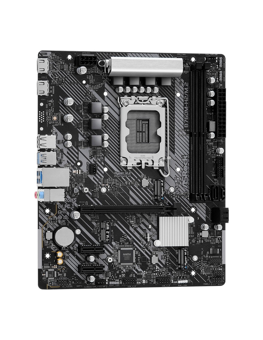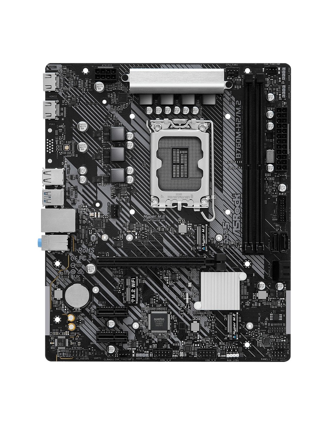 Asrock B760M-H2/M.2. Fabricante de procesador: Intel, Socket de procesador: LGA 1700, Procesador compatible: Intel® Core™ i3, Intel® Core™ i5, Intel® Core™ i7, Intel® Core™ i9. tipos de memoria compatibles: DDR5-SDRAM, Memoria interna máxima: 128 GB, Tipo de ranuras de memoria: DIMM. Interfaces de disco de almacenamiento soportados: M.2, SATA III, Niveles RAID: 0, 1, 5, 10. Tipo de interfaz ethernet: 2.5 Gigabit Ethernet. Componente para: PC, Factor de forma: micro ATX, Familia del chipset: Intel