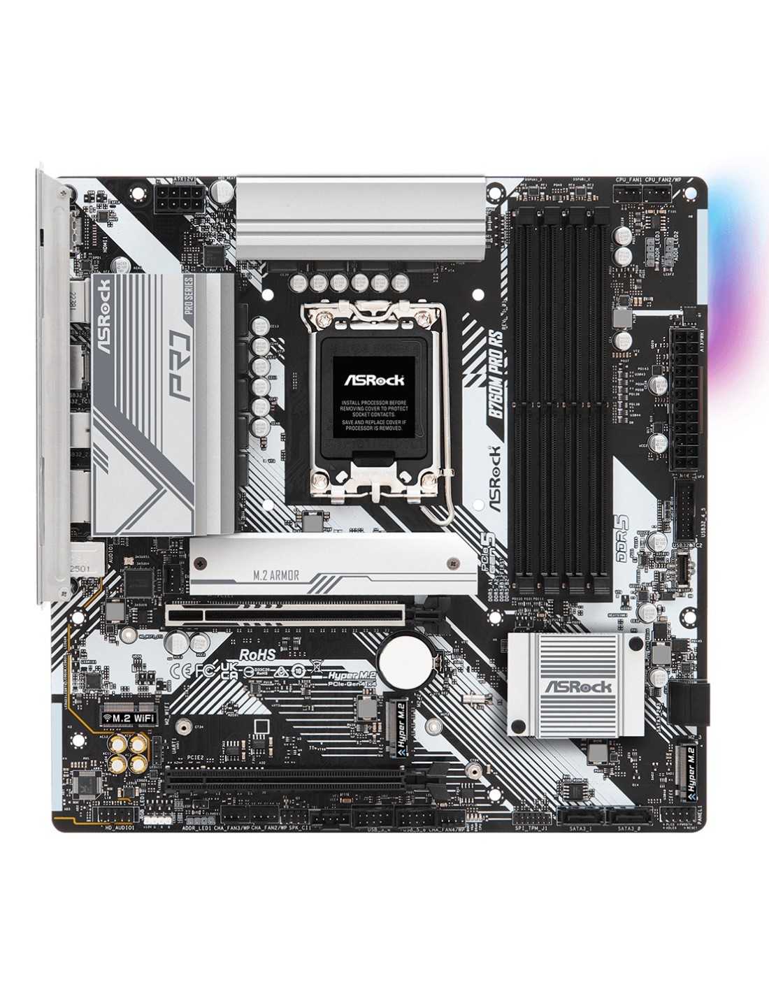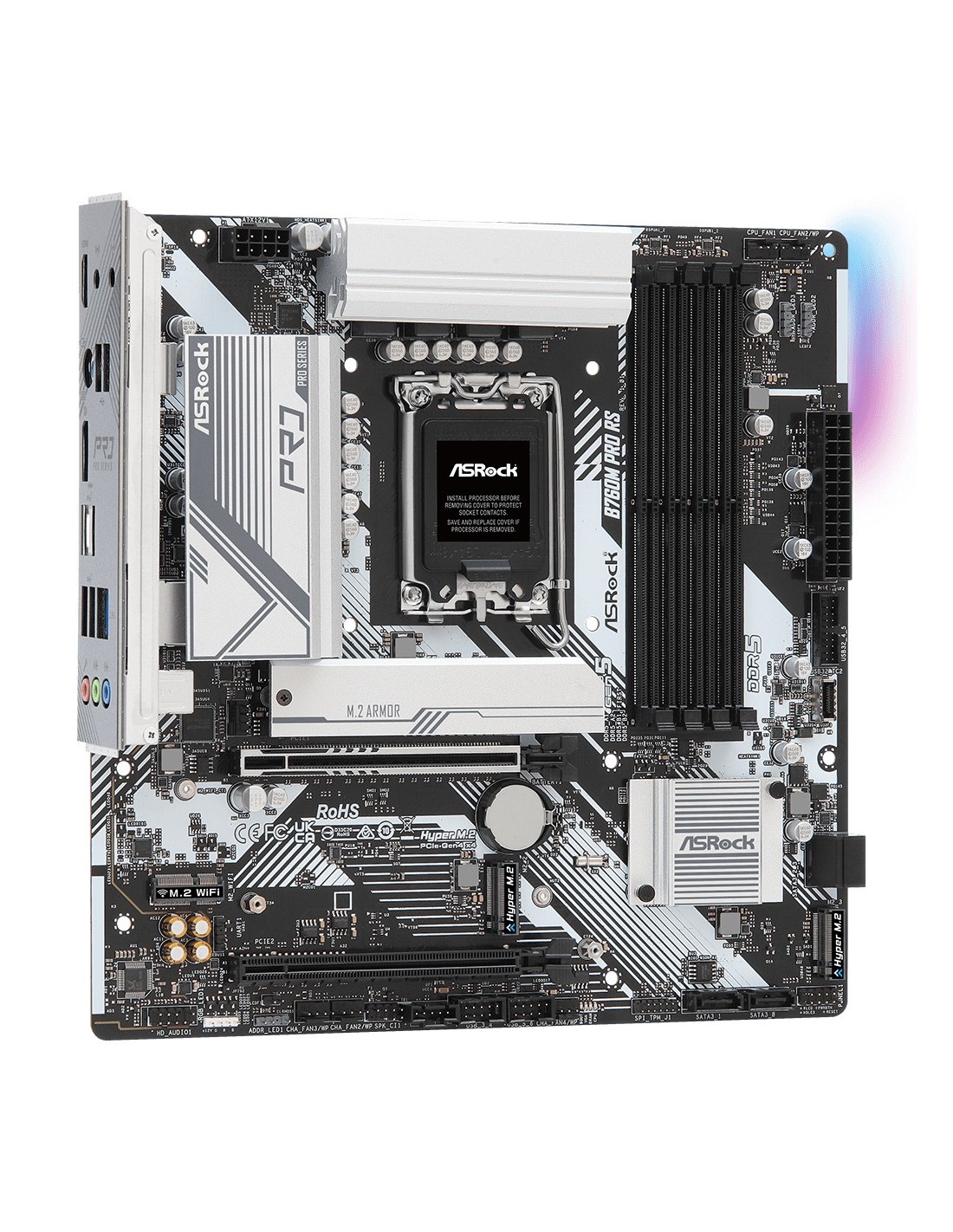 Asrock B760M Pro RS. Fabricante de procesador: Intel, Socket de procesador: LGA 1700, Procesador compatible: Intel® Core™ i5, Intel® Core™ i7, Intel® Core™ i9. tipos de memoria compatibles: DDR5-SDRAM, Memoria interna máxima: 192 GB, Tipo de ranuras de memoria: DIMM. Interfaces de disco de almacenamiento soportados: M.2, SATA III, Tipos de unidades de almacenamiento admitidas: HDD & SSD. Tipo de interfaz ethernet: 2.5 Gigabit Ethernet, Controlador LAN: Realtek RTL8125-BG. Componente para: PC, Factor de forma: micro ATX, Familia del chipset: Intel