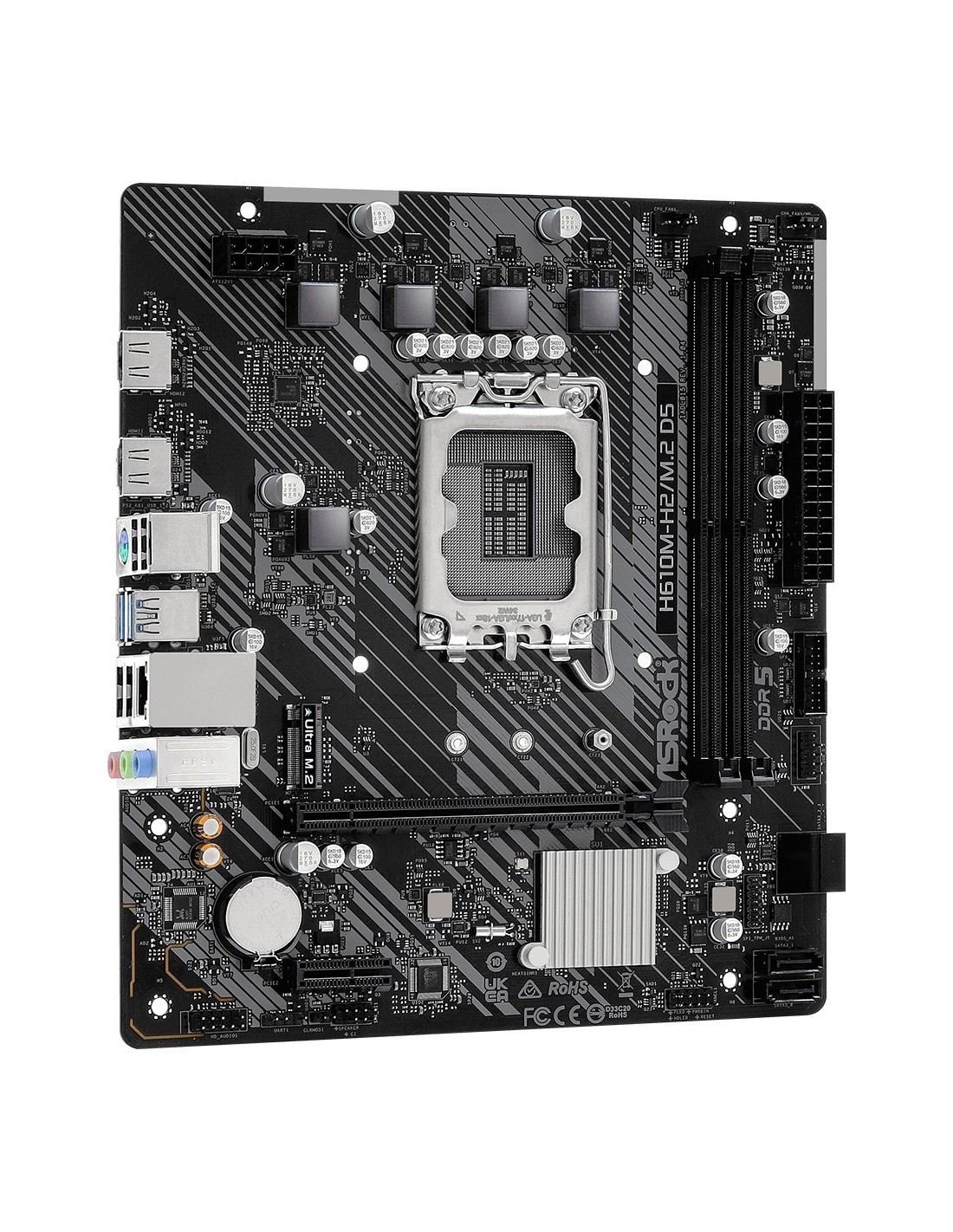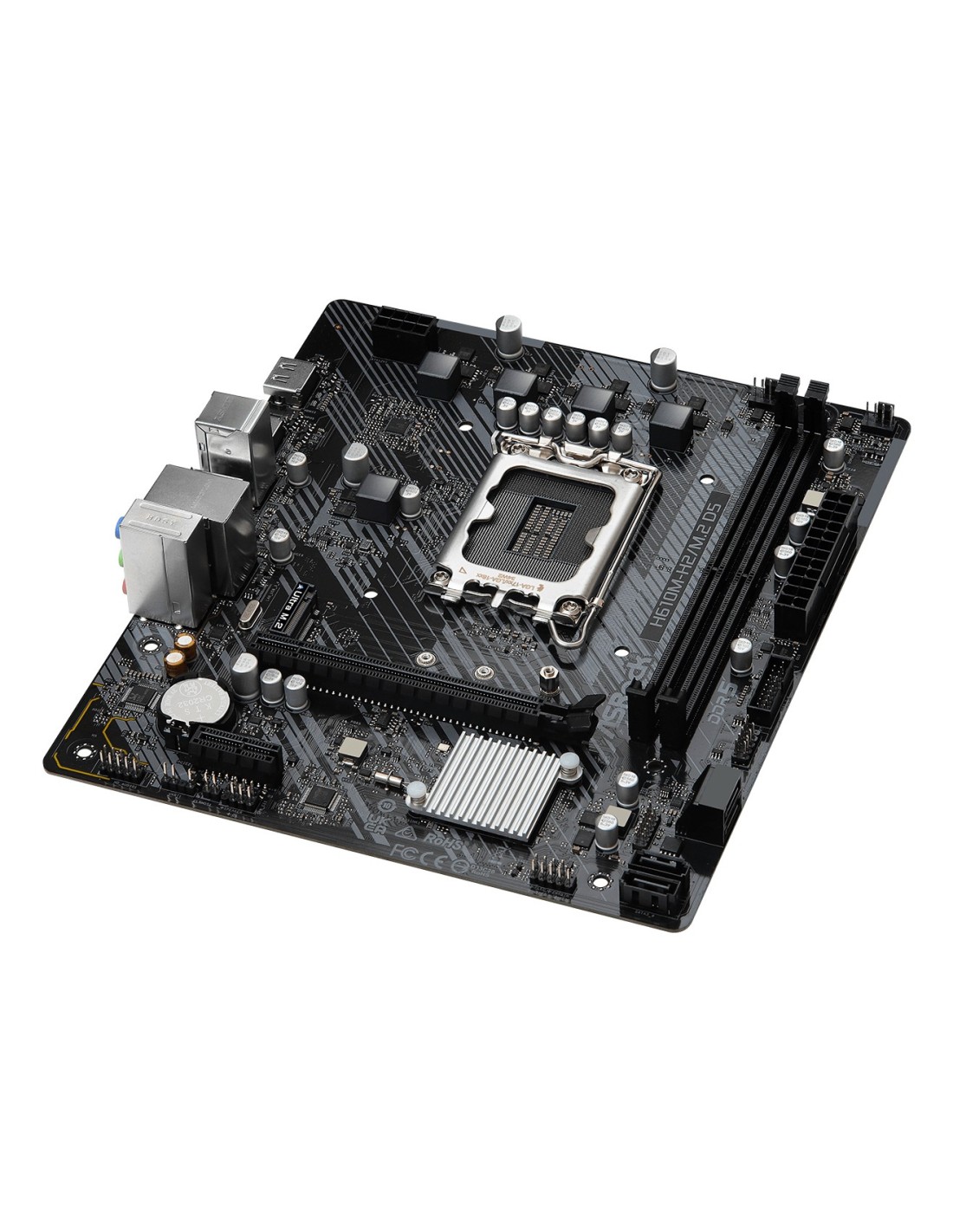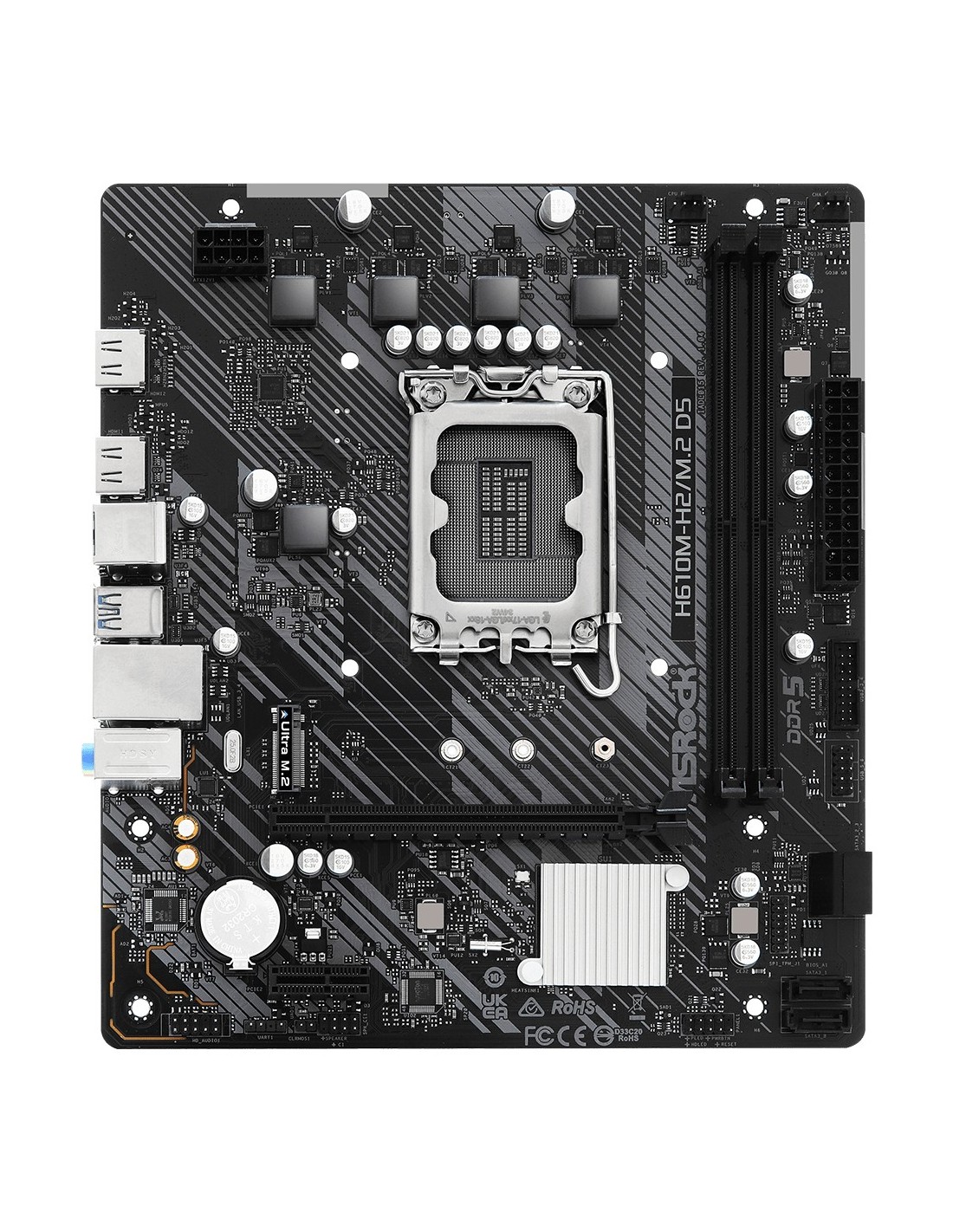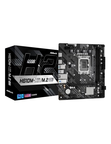 Asrock H610M-H2/M.2 D5. Fabricante de procesador: Intel, Socket de procesador: LGA 1700. tipos de memoria compatibles: DDR5-SDRAM, Memoria interna máxima: 96 GB, Tipo de ranuras de memoria: DIMM. Interfaces de disco de almacenamiento soportados: M.2, SATA III. Tipo de interfaz ethernet: Gigabit Ethernet, Controlador LAN: Realtek 8111H. Componente para: PC, Factor de forma: micro ATX, Familia del chipset: Intel