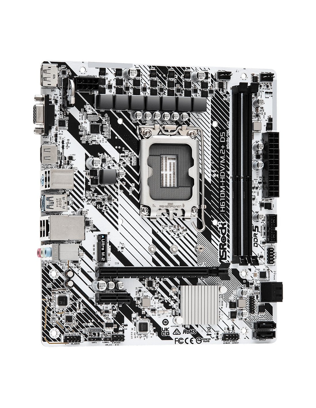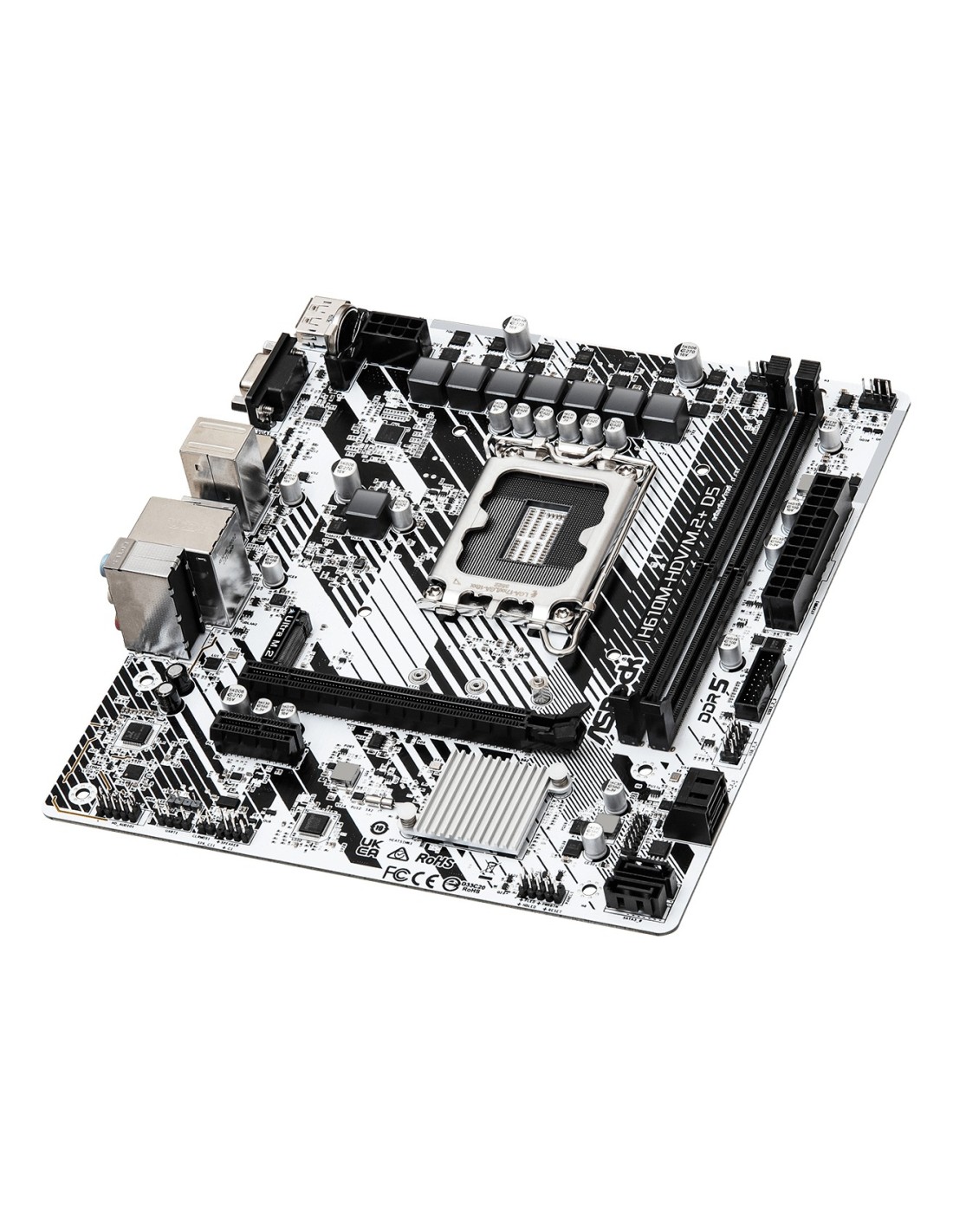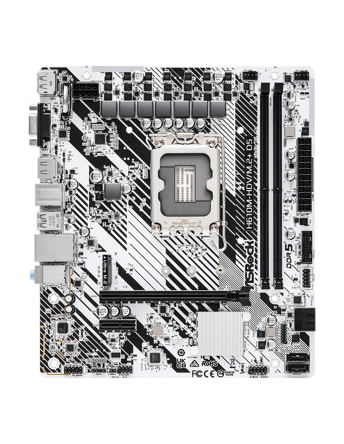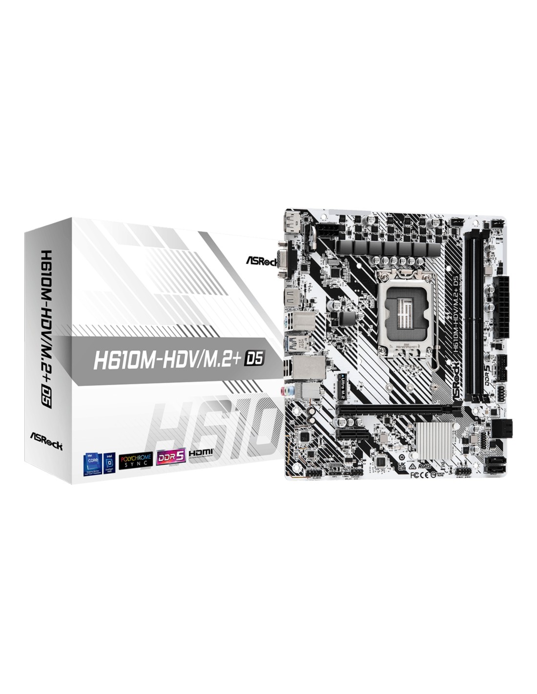 Asrock H610M-HDV/M.2+ D5. Fabricante de procesador: Intel, Socket de procesador: LGA 1700. tipos de memoria compatibles: DDR5-SDRAM, Memoria interna máxima: 96 GB, Tipo de ranuras de memoria: DIMM. Interfaces de disco de almacenamiento soportados: SATA III. Tipo de interfaz ethernet: Gigabit Ethernet, Controlador LAN: Realtek RTL8111H. Componente para: PC, Factor de forma: micro ATX, Familia del chipset: Intel