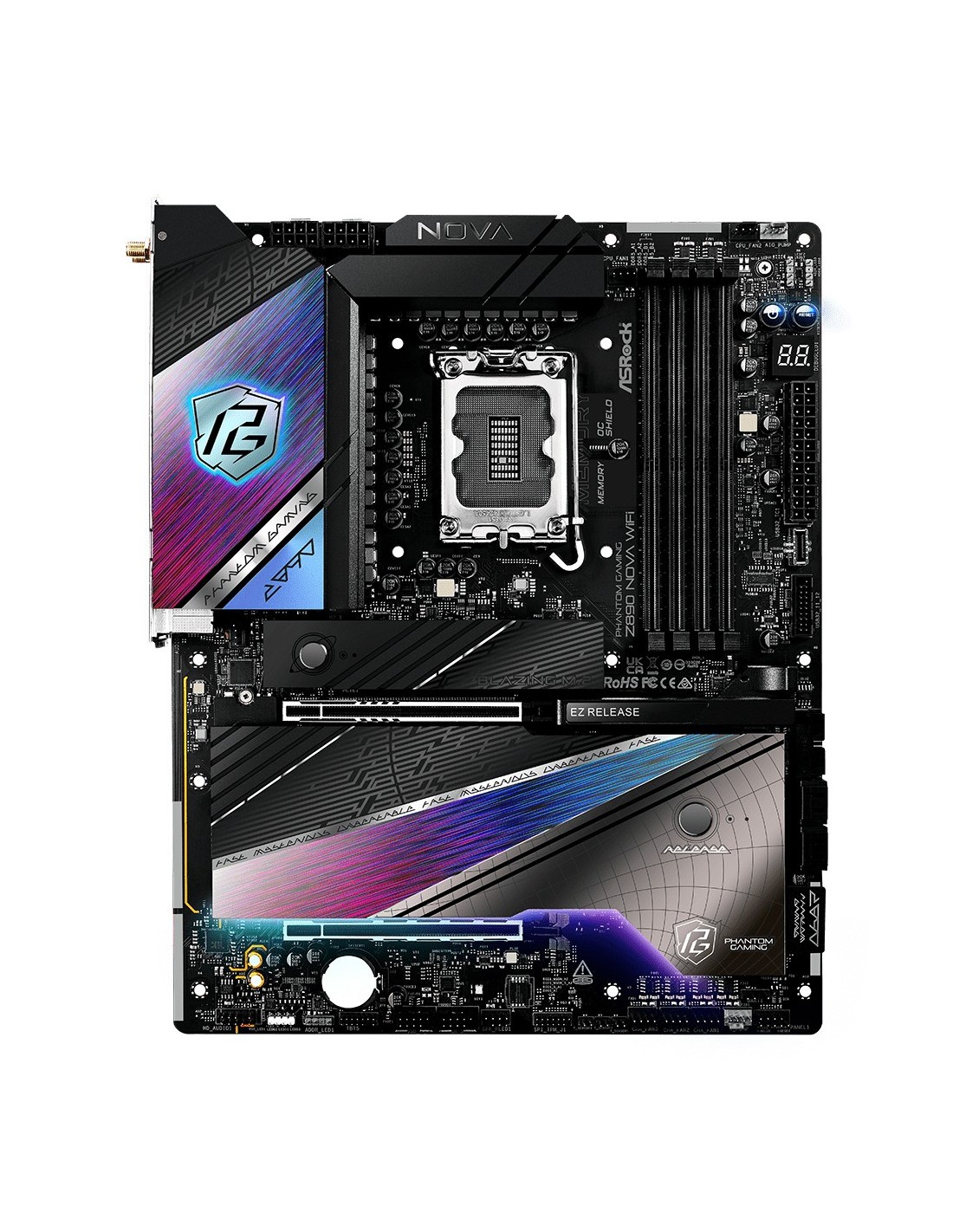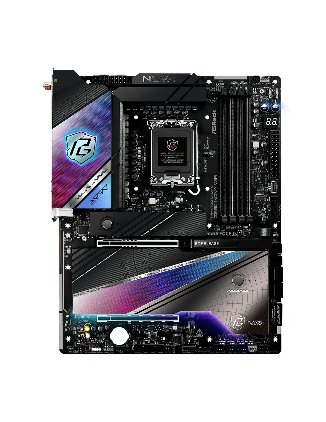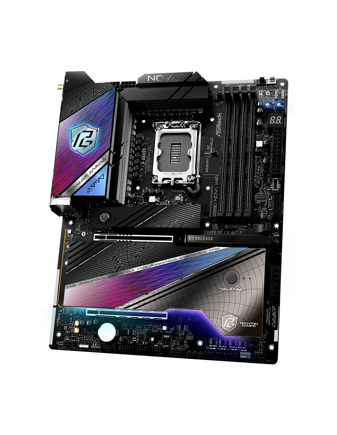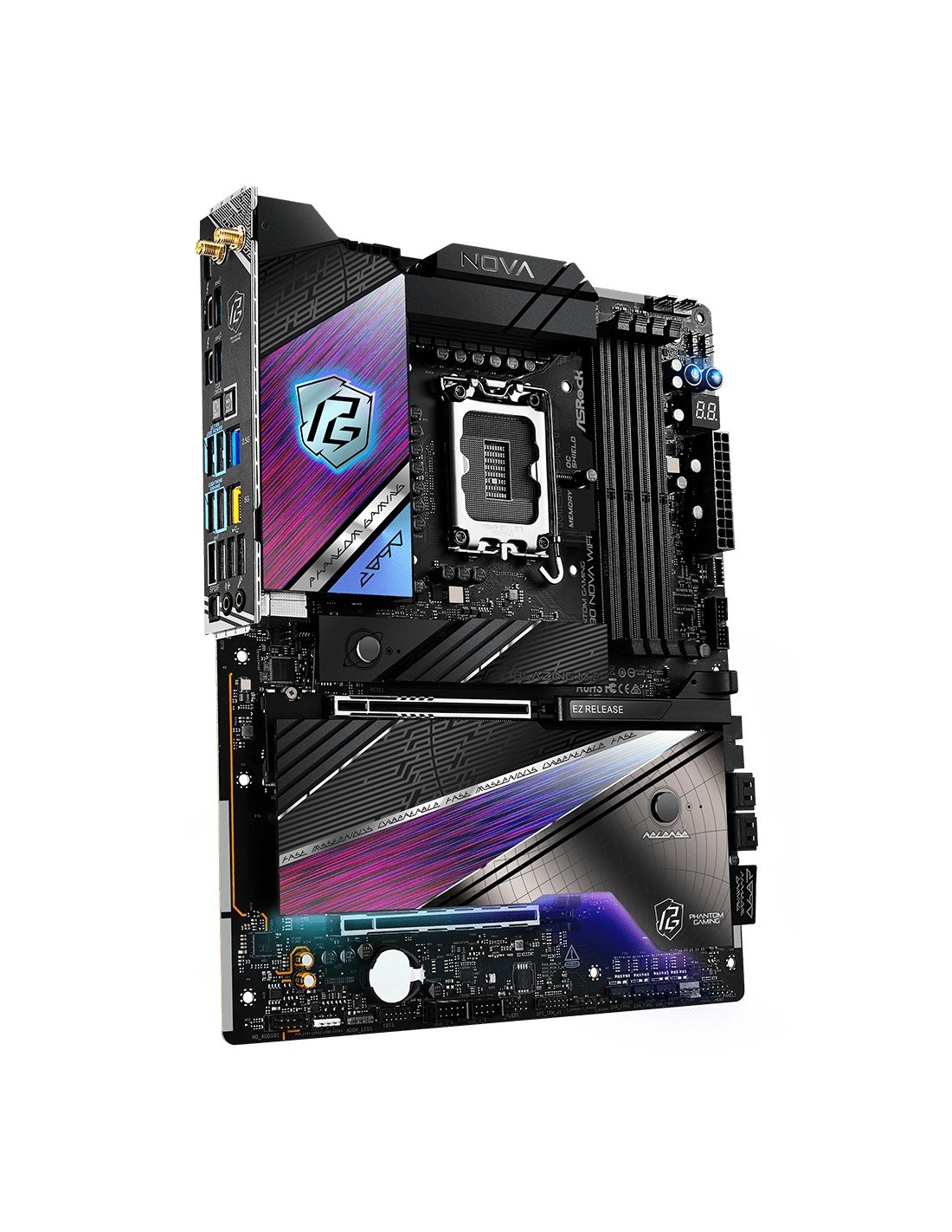 Asrock Phantom Gaming Z890 Nova WiFi. Fabricante de procesador: Intel, Socket de procesador: LGA 1851 (Socket V1), Procesador compatible: Intel Core Ultra (Series 2). tipos de memoria compatibles: DDR5-SDRAM, Memoria interna máxima: 256 GB, Tipo de ranuras de memoria: DIMM. Interfaces de disco de almacenamiento soportados: PCI Express 4.0, PCI Express 5.0, SATA III, Tipos de unidades de almacenamiento admitidas: HDD & SSD, Niveles RAID: 0, 1, 5, 10. Máxima resolución: 7680 x 4320 Pixeles. Conector USB: USB tipo A, USB Tipo C