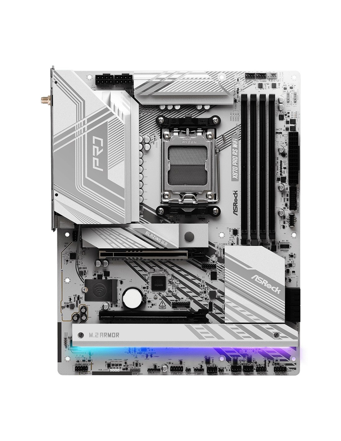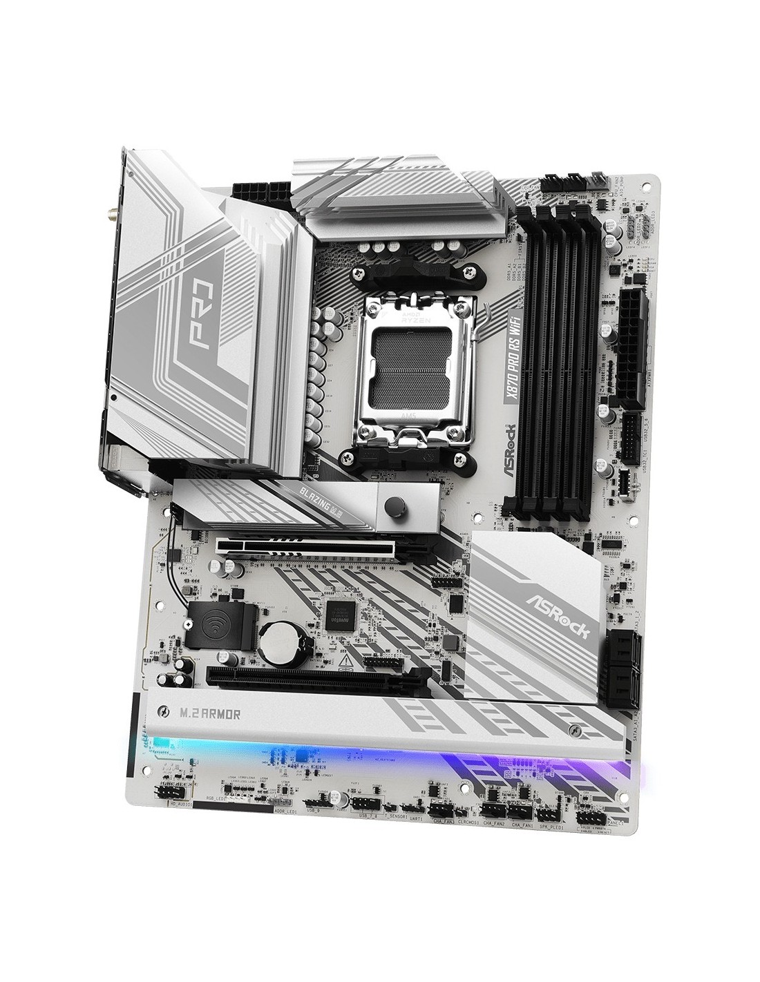 Asrock X870 Pro RS WiFi. Fabricante de procesador: AMD, Socket de procesador: Zócalo AM5, Procesador compatible: AMD Ryzen 7000 Series, AMD Ryzen 8000 Series, AMD Ryzen 9000 Series. tipos de memoria compatibles: DDR5-SDRAM, Memoria interna máxima: 256 GB, Tipo de ranuras de memoria: DIMM. Interfaces de disco de almacenamiento soportados: M.2, SATA III, Tipos de unidades de almacenamiento admitidas: HDD & SSD, Niveles RAID: 0, 1. Soporte para proceso paralelo: CrossFire. Tipo de interfaz ethernet: 2.5 Gigabit Ethernet, Controlador LAN: Dragon RTL8125BG, Estándar Wi-Fi: Wi-Fi 7 (802.11be)