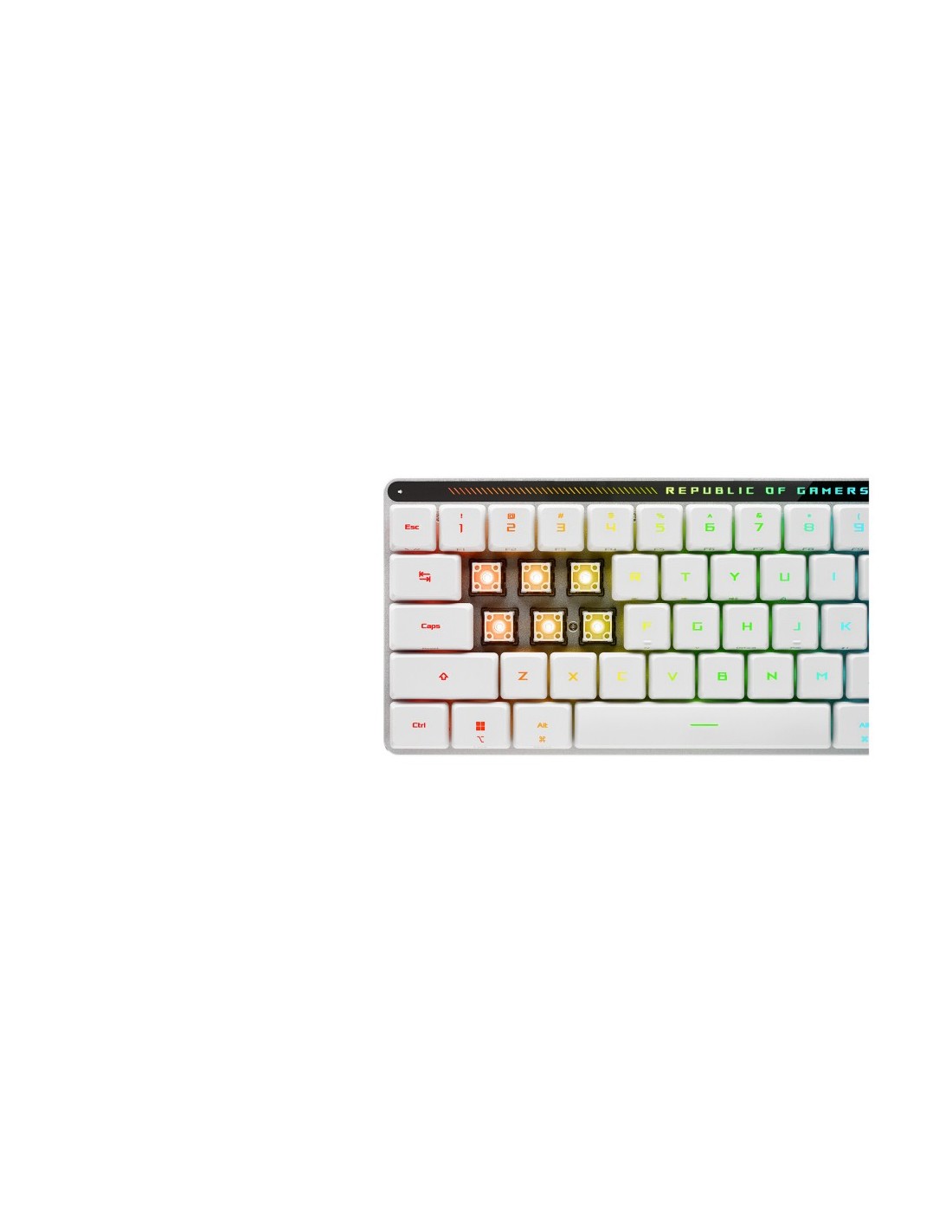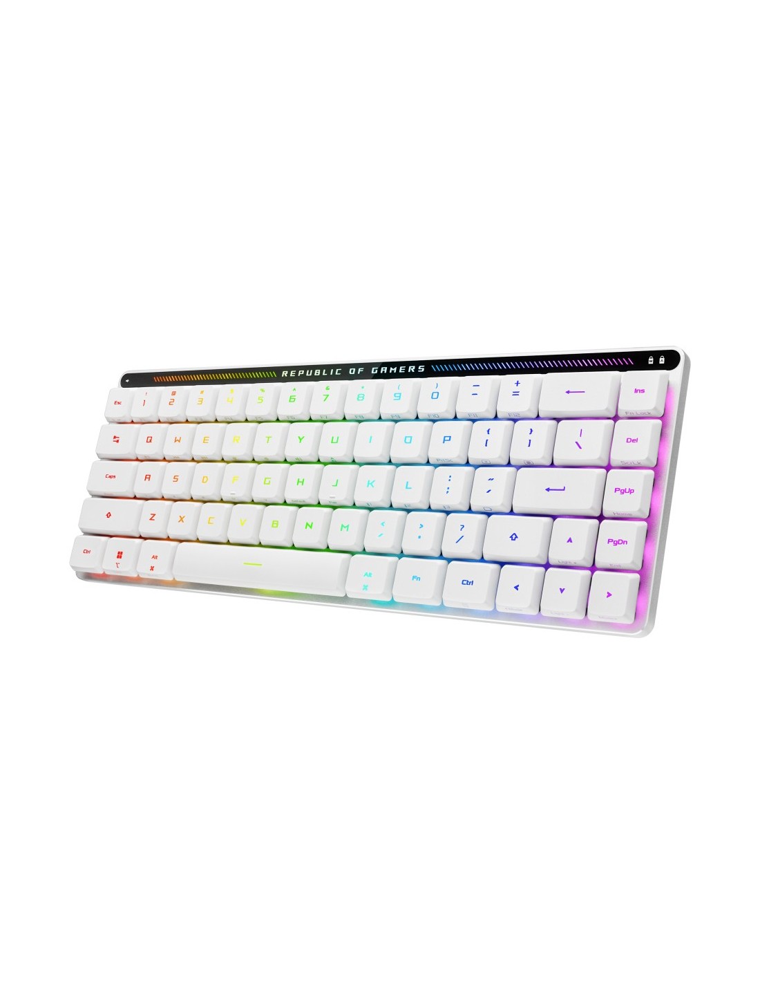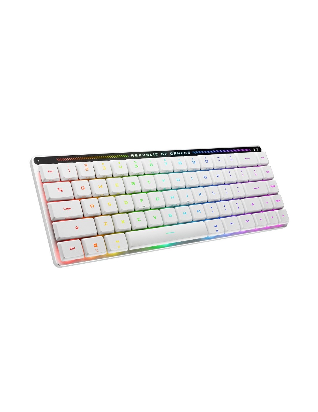 ASUS 90MP03EC-BKSA10. Formato del teclado: 65%. Estilo de teclado: Derecho. Tecnología de conectividad: Inalámbrico y alámbrico, Interfaz del dispositivo: USB + RF Wireless + Bluetooth, Interruptor del teclado: Switch de tecla óptico. Tipo de retroiluminación: LED RGB. Uso recomendado: Juego. Color del producto: Blanco