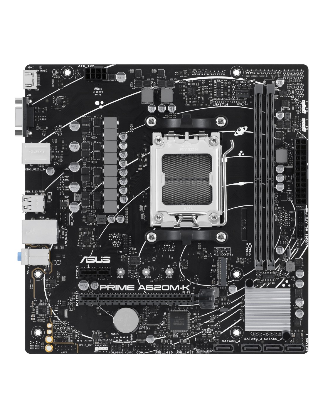 ASUS PRIME A620M-K. Fabricante de procesador: AMD, Socket de procesador: Zócalo AM5, Procesador compatible: AMD Ryzen 7000 Series. tipos de memoria compatibles: DDR5-SDRAM, Memoria interna máxima: 96 GB, Canales de memoria: Doble canal. Interfaces de disco de almacenamiento soportados: M.2, SATA III, Tipos de unidades de almacenamiento admitidas: HDD & SSD. Tipo de interfaz ethernet: Ethernet rápido, Gigabit Ethernet. Componente para: PC, Factor de forma: micro ATX, Familia del chipset: AMD
