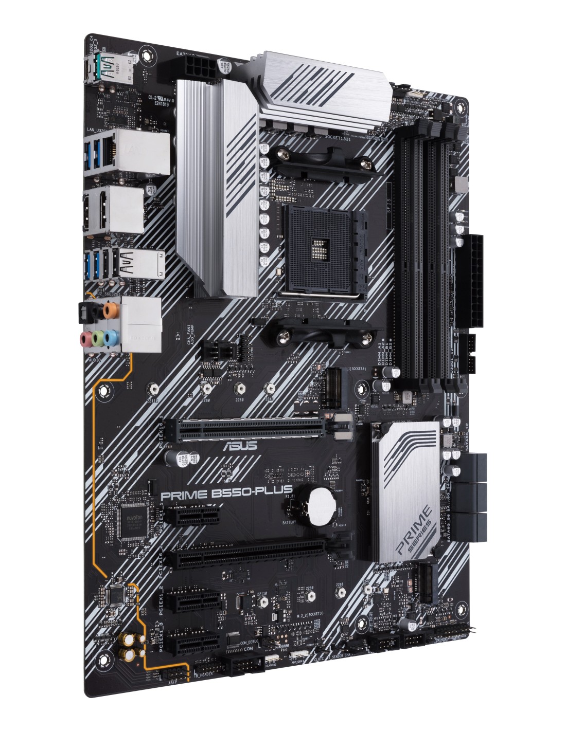 ASUS PRIME B550-PLUS. Fabricante de procesador: AMD, Socket de procesador: Zócalo AM4, Procesador compatible: AMD Ryzen 3000 Series. tipos de memoria compatibles: DDR4-SDRAM, Memoria interna máxima: 128 GB, Tipo de ranuras de memoria: DIMM. Interfaces de disco de almacenamiento soportados: M.2, SATA, Niveles RAID: 0, 1, 10. Soporte para proceso paralelo: 2-Way CrossFireX. Tipo de interfaz ethernet: Gigabit Ethernet, Controlador LAN: Realtek RTL8111H