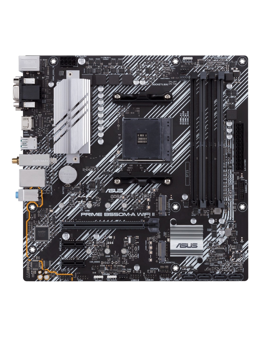 ASUS PRIME B550M-A WIFI II. Fabricante de procesador: AMD, Socket de procesador: Zócalo AM4, Procesador compatible: AMD Ryzen 3000 Series, AMD Ryzen 5000 Series. tipos de memoria compatibles: DDR4-SDRAM, Memoria interna máxima: 128 GB, Tipo de ranuras de memoria: DIMM. Interfaces de disco de almacenamiento soportados: M.2, PCI Express 3.0, PCI Express 4.0, SATA III, Tipos de unidades de almacenamiento admitidas: HDD & SSD, Niveles RAID: 0, 1, 10. Conector USB: USB tipo A. Tipo de interfaz ethernet: Gigabit Ethernet, Controlador LAN: Realtek RTL8111H, Estándar Wi-Fi: Wi-Fi 6 (802.11ax)
