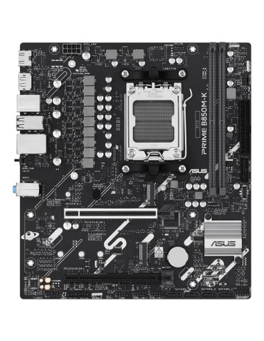 ASUS PRIME B850M-K. Fabricante de procesador: AMD, Socket de procesador: Zócalo AM5, Procesador compatible: AMD Ryzen 7000 Series, AMD Ryzen 8000 Series, AMD Ryzen 9000 Series. tipos de memoria compatibles: DDR5-SDRAM, Memoria interna máxima: 128 GB, Tipo de ranuras de memoria: DIMM. Interfaces de disco de almacenamiento soportados: M.2, SATA III, Tipos de unidades de almacenamiento admitidas: HDD & SSD, Niveles RAID: 0, 1, 5, 10. Tipo de interfaz ethernet: 2.5 Gigabit Ethernet. Componente para: PC, Factor de forma: micro ATX, Familia del chipset: AMD