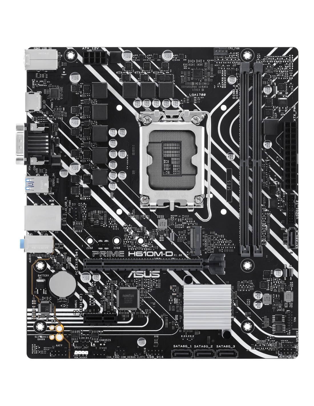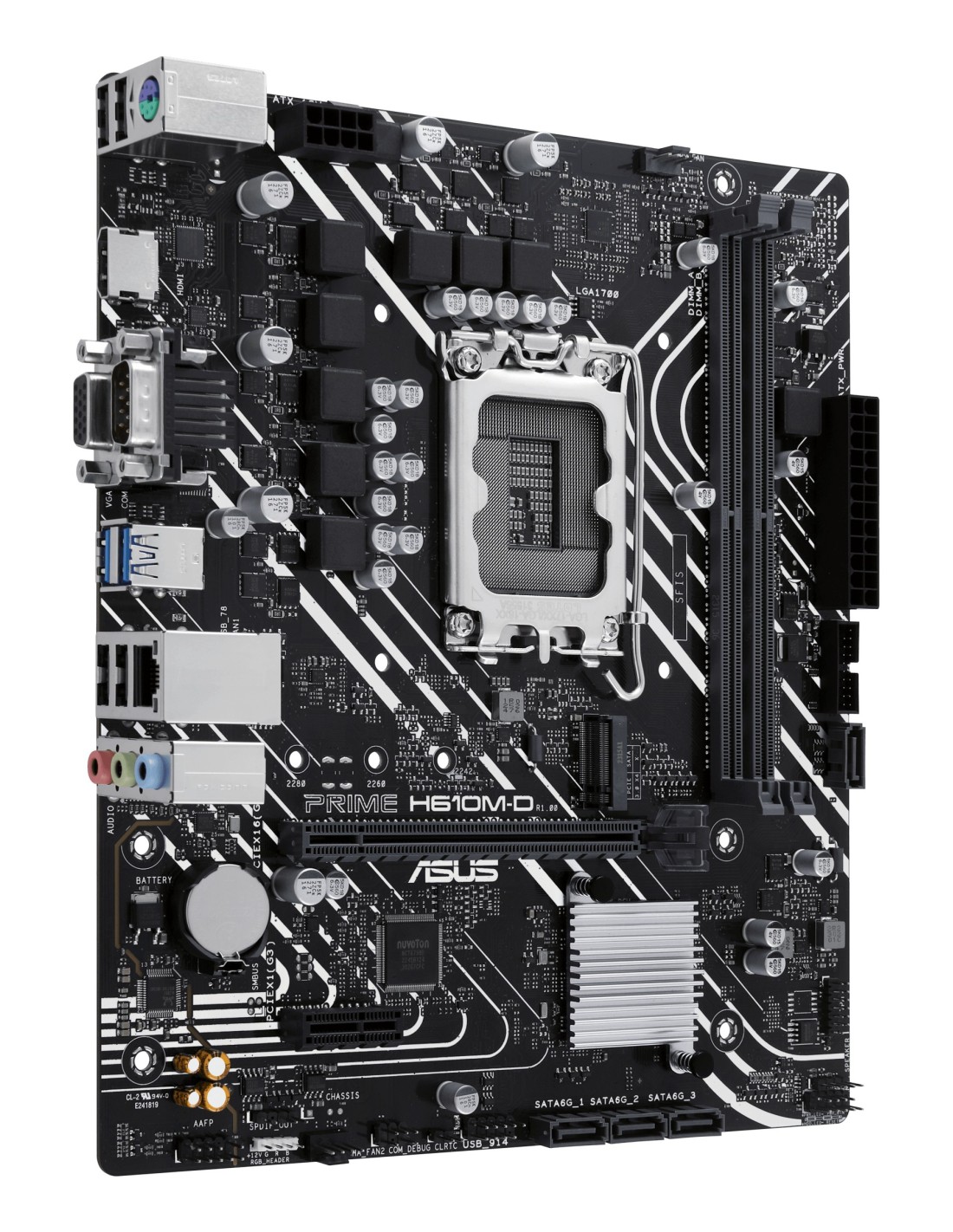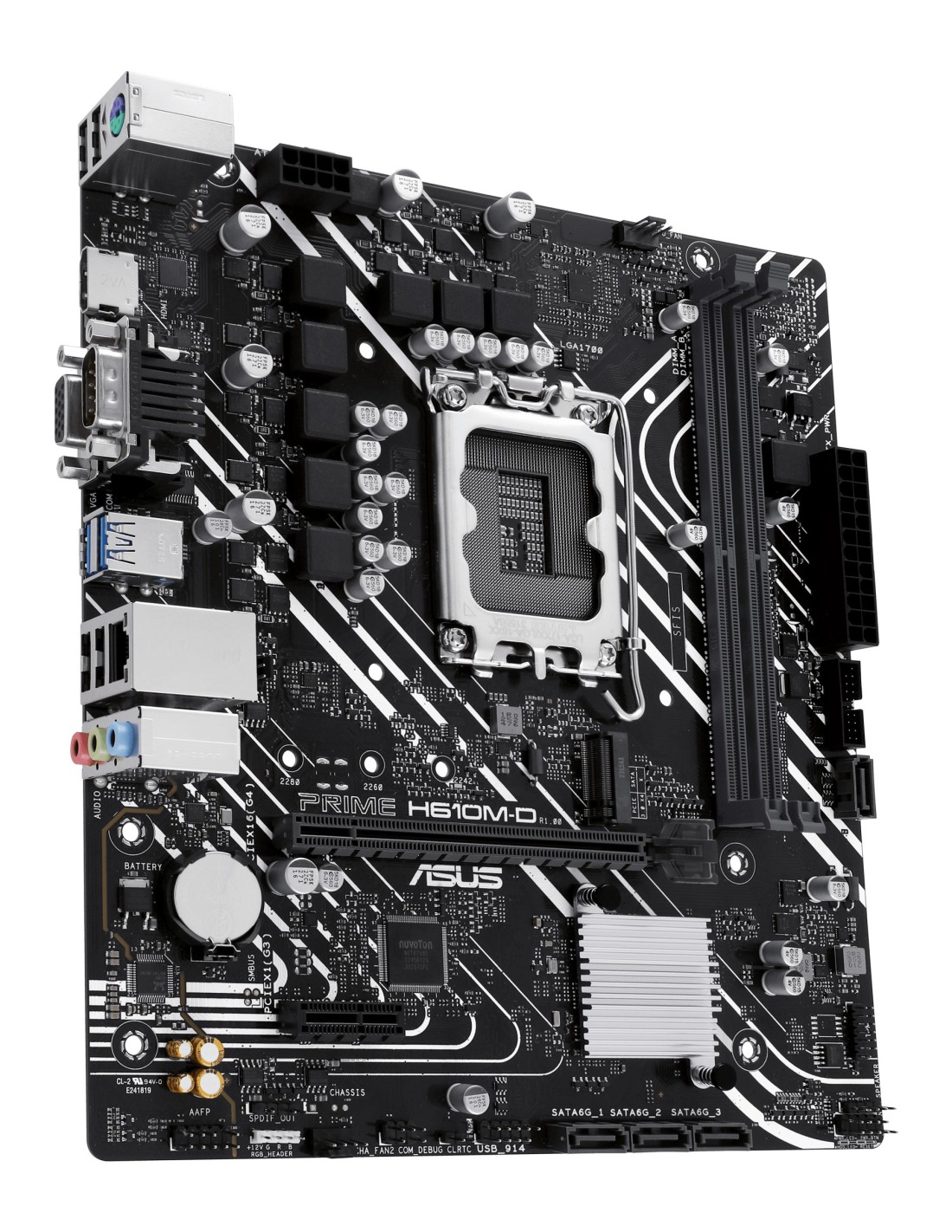 ASUS PRIME H610M-D. Fabricante de procesador: Intel, Socket de procesador: LGA 1700, Procesador compatible: Intel® Celeron®, Intel® Pentium® Gold, Intel® Core™ i3, Intel® Core™ i5, Intel® Core™.... tipos de memoria compatibles: DDR5-SDRAM, Memoria interna máxima: 96 GB, Tipo de ranuras de memoria: DIMM. Interfaces de disco de almacenamiento soportados: M.2, SATA III, Tipos de unidades de almacenamiento admitidas: HDD & SSD. Tipo de interfaz ethernet: Gigabit Ethernet. Componente para: PC, Factor de forma: micro ATX, Familia del chipset: Intel