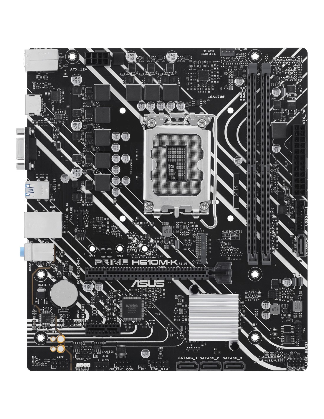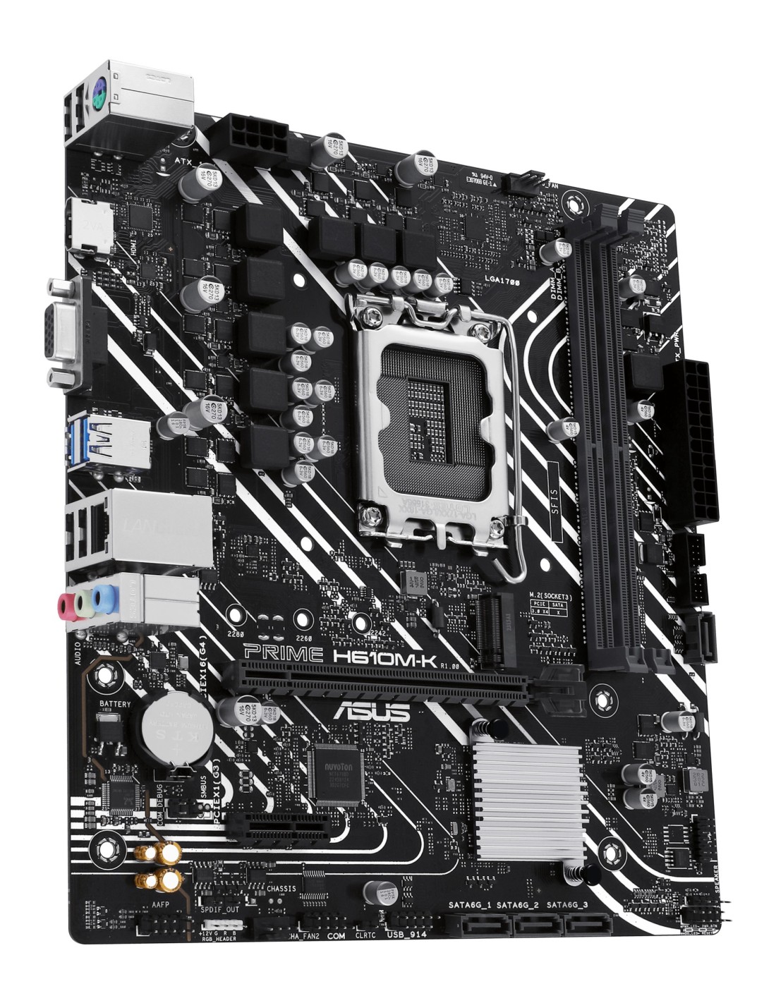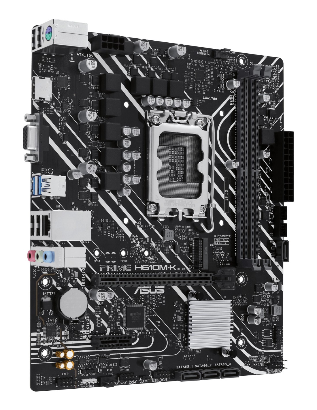 ASUS Prime H610M-K. Fabricante de procesador: Intel, Socket de procesador: LGA 1700, Procesador compatible: Intel® Celeron®, Intel® Core™ i3, Intel® Core™ i5, Intel® Core™ i7, Intel® Core™ i9,.... tipos de memoria compatibles: DDR5-SDRAM, Memoria interna máxima: 96 GB, Tipo de ranuras de memoria: DIMM. Interfaces de disco de almacenamiento soportados: M.2, SATA III, Tipos de unidades de almacenamiento admitidas: HDD & SSD. Conector USB: USB tipo A. Tipo de interfaz ethernet: Gigabit Ethernet