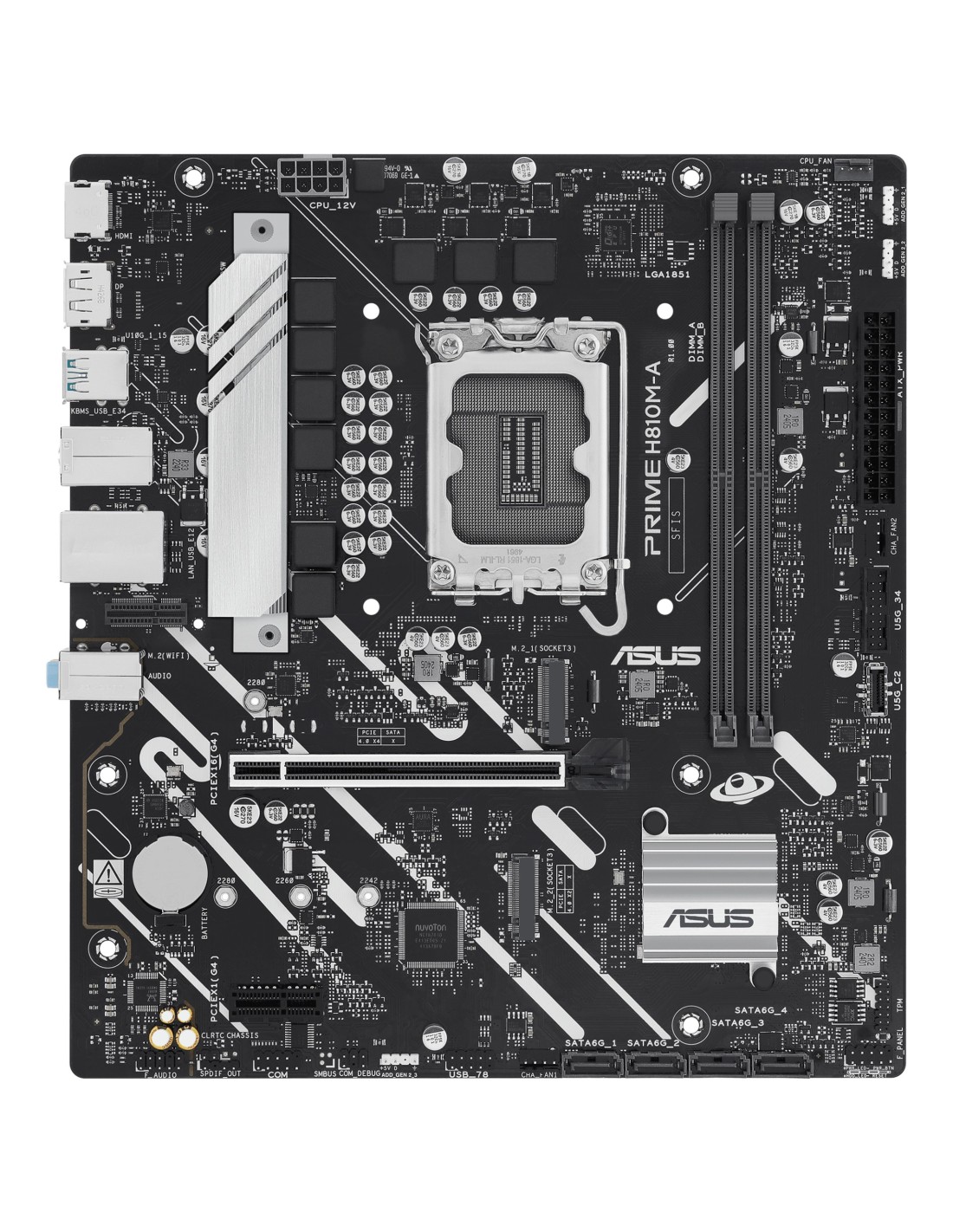 ASUS PRIME H810M-A-CSM. Fabricante de procesador: Intel, Socket de procesador: LGA 1851 (Socket V1), Procesador compatible: Intel Core Ultra (Series 2). tipos de memoria compatibles: DDR5-SDRAM, Memoria interna máxima: 128 GB, Tipo de ranuras de memoria: DIMM. Interfaces de disco de almacenamiento soportados: M.2, PCI Express 4.0, SATA III, Tipos de unidades de almacenamiento admitidas: HDD & SSD. Tipo de interfaz ethernet: Gigabit Ethernet, Controlador LAN: Intel I219V. Componente para: PC, Factor de forma: micro ATX, Familia del chipset: Intel
