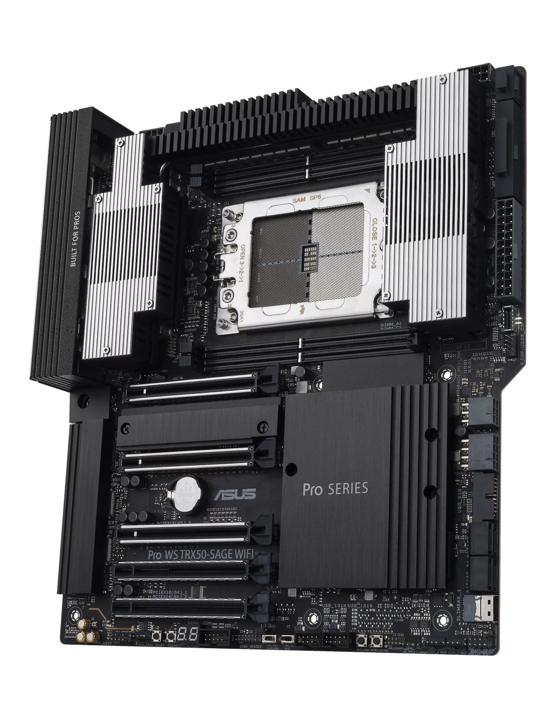 ASUS Pro WS TRX50-SAGE WIFI. Fabricante de procesador: AMD, Socket de procesador: Socket sTR5, Procesador compatible: AMD Ryzen Threadripper 1000 Series. tipos de memoria compatibles: DDR5-SDRAM, Memoria interna máxima: 1 TB, Tipo de ranuras de memoria: DIMM. Interfaces de disco de almacenamiento soportados: M.2, SATA III, Tipos de unidades de almacenamiento admitidas: HDD & SSD, Niveles RAID: 0, 1, 5, 10. Conector USB: USB tipo A, USB Tipo C. Tipo de interfaz ethernet: 2.5 Gigabit Ethernet, 10 Gigabit Ethernet, Controlador LAN: Intel I226-LM, Estándar Wi-Fi: Wi-Fi 7 (802.11be)