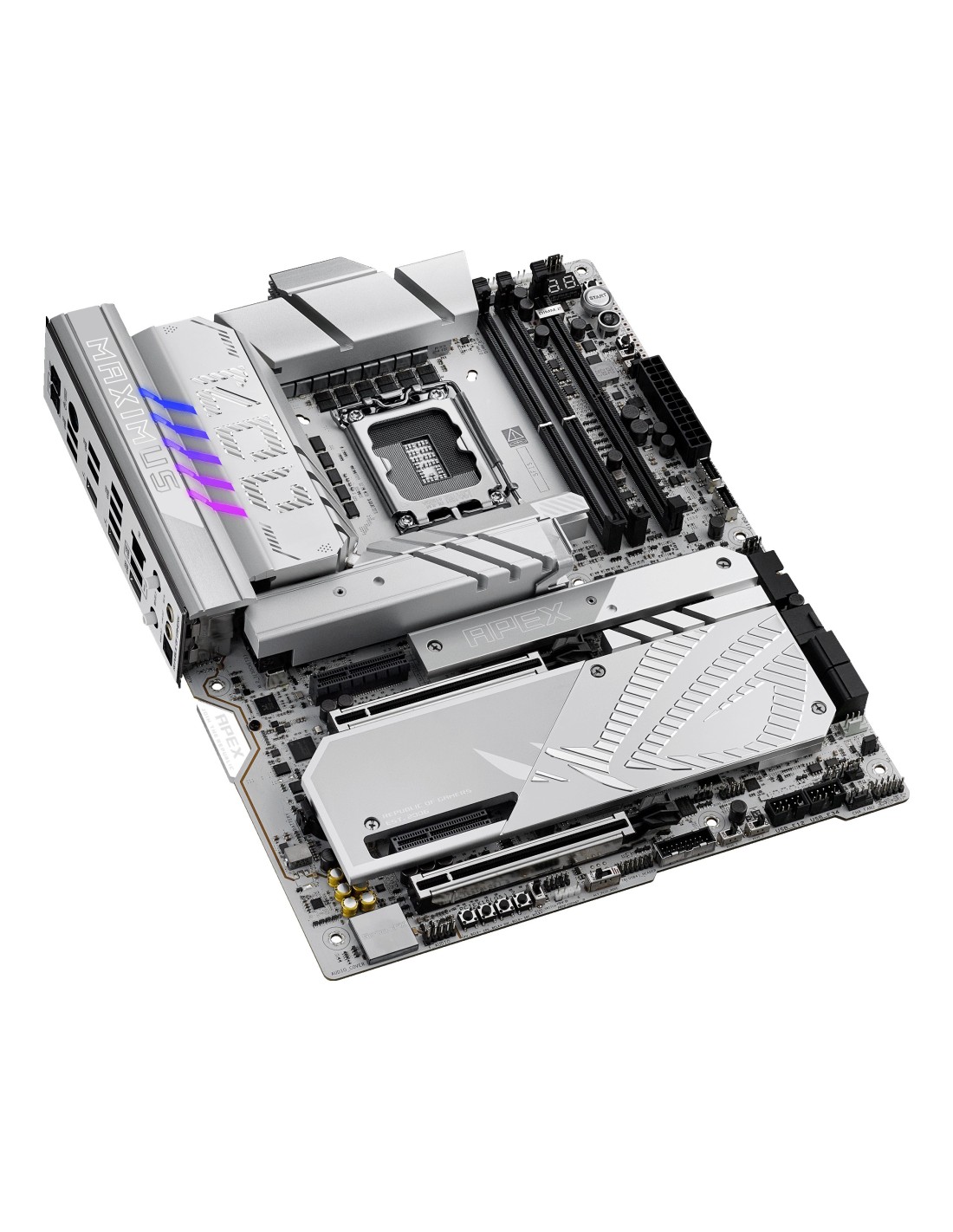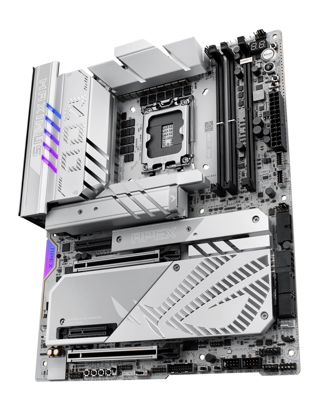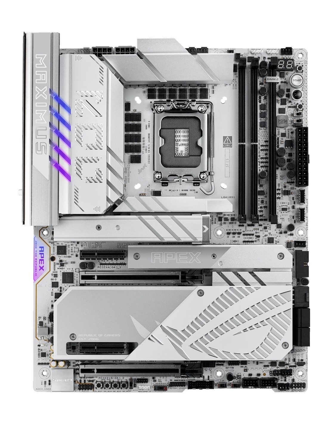 ASUS ROG MAXIMUS Z890 APEX. Fabricante de procesador: Intel, Socket de procesador: LGA 1851 (Socket V1), Procesador compatible: Intel Core Ultra (Series 2). tipos de memoria compatibles: DDR5-SDRAM, Memoria interna máxima: 96 GB, Tipo de ranuras de memoria: DIMM. Interfaces de disco de almacenamiento soportados: M.2, SATA III, Tipos de unidades de almacenamiento admitidas: HDD & SSD, Niveles RAID: 0, 1, 5, 10. Tipo de interfaz ethernet: 5 Gigabit Ethernet, Estándar Wi-Fi: Wi-Fi 7 (802.11be), Wi-Fi estándares: Wi-Fi 7 (802.11be). Componente para: PC, Factor de forma: ATX, Familia del chipset: Intel