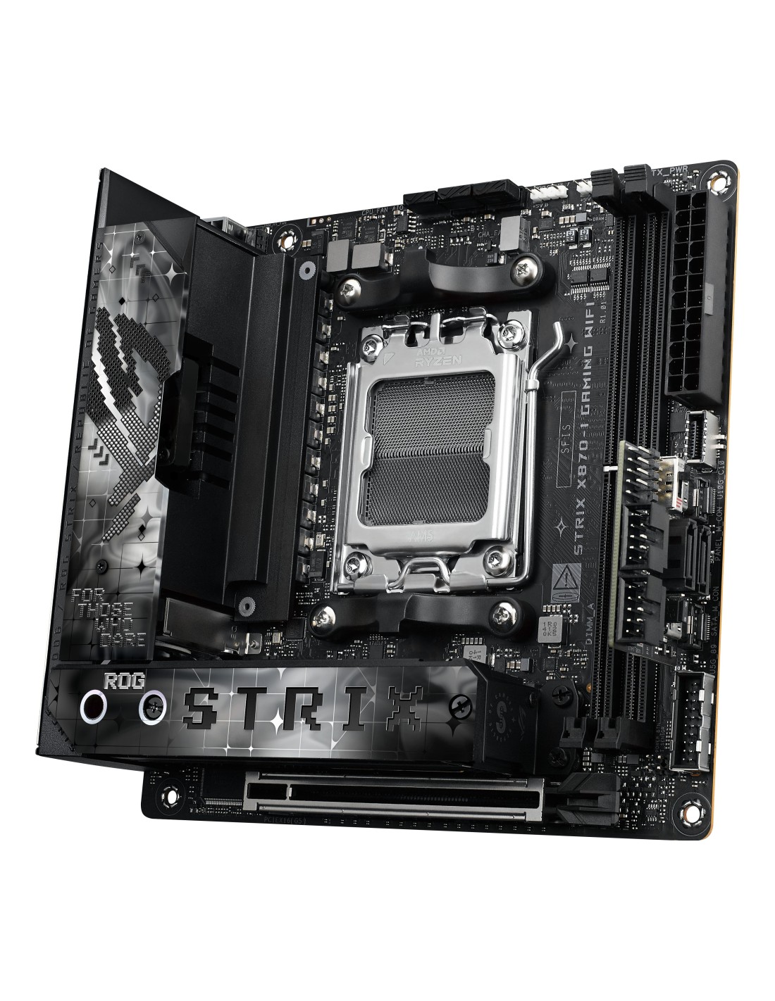 ASUS ROG STRIX X870-I GAMING WIFI. Fabricante de procesador: AMD, Socket de procesador: Zócalo AM5, Procesador compatible: AMD Ryzen 7000 Series, AMD Ryzen 8000 Series, AMD Ryzen 9000 Series. tipos de memoria compatibles: DDR5-SDRAM, Memoria interna máxima: 96 GB, Tipo de ranuras de memoria: DIMM. Interfaces de disco de almacenamiento soportados: M.2, SATA III, Tipos de unidades de almacenamiento admitidas: HDD & SSD, Niveles RAID: 0, 1, 10. Conector USB: USB tipo A, USB Tipo C. Tipo de interfaz ethernet: 2.5 Gigabit Ethernet, Ethernet rápido, Gigabit Ethernet, Estándar Wi-Fi: Wi-Fi 7 (802.11be), Wi-Fi estándares: Wi-Fi 7 (802.11be)