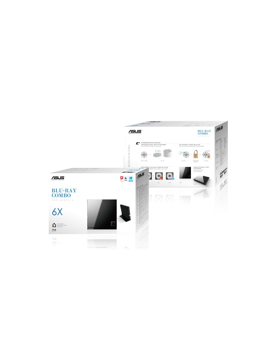 ASUS SBC-06D2X-U. Color del producto: Negro, Tipo de carga en disco: Bandeja, Montaje: Vertical/Horizontal. Utilizar con: Portátil, Tipo de unidad óptica: Blu-Ray DVD Combo, Interfaz: USB 2.0. Velocidad de escritura en CD: 24x, DVD+R, velociad de escritura: 8x, Velocidad de reescritura en CD: 16x. Velocidad de lectura de CD: 24x, CD-R, velocidad de lectura: 24x, CD-RW, velocidad de lectura: 24x. DVD, tiempo promedio de acceso: 180 ms, Unidad CD-ROM tiempo promedio de acceso: 190 ms, BD-ROM tiempo promedio de acceso aleatorio: 230 ms